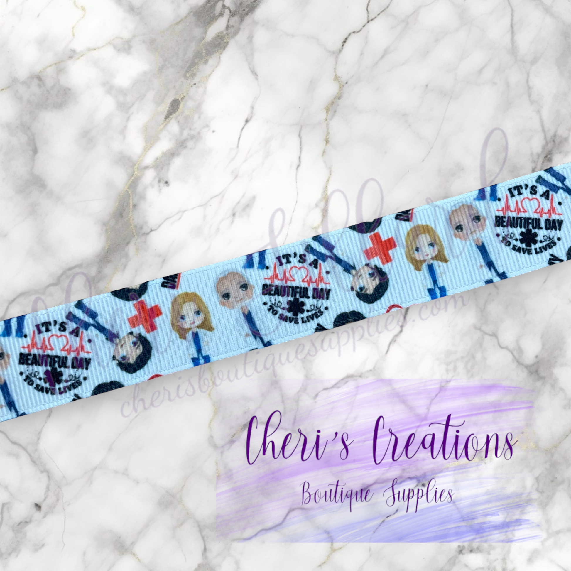 A Great Day for Saving Lives Doctor Nurse 7/8" Grosgrain Ribbon by the Yard