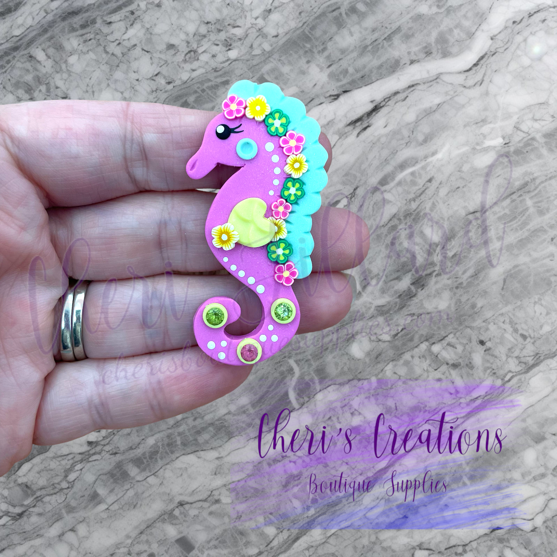 Add a splash of seaside charm to your crafts with this adorable handmade pink and mint green seahorse embellishment! With its soft pastel colors and whimsical design, this little sea creature is perfect for bow centers, keychains, magnets, scrapbooking, and more. Whether you're creating a beachy-themed project or just love all things ocean-inspired, this seahorse is sure to make waves!