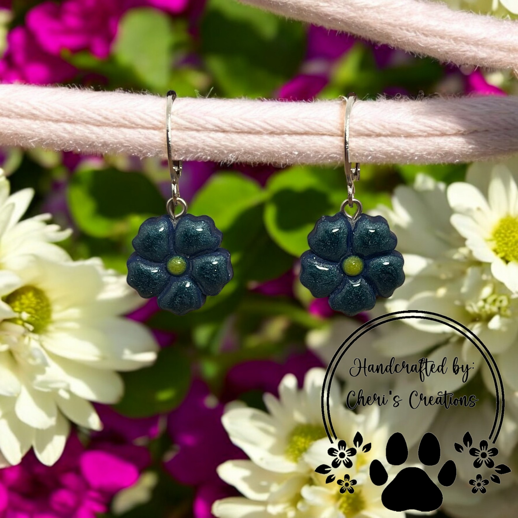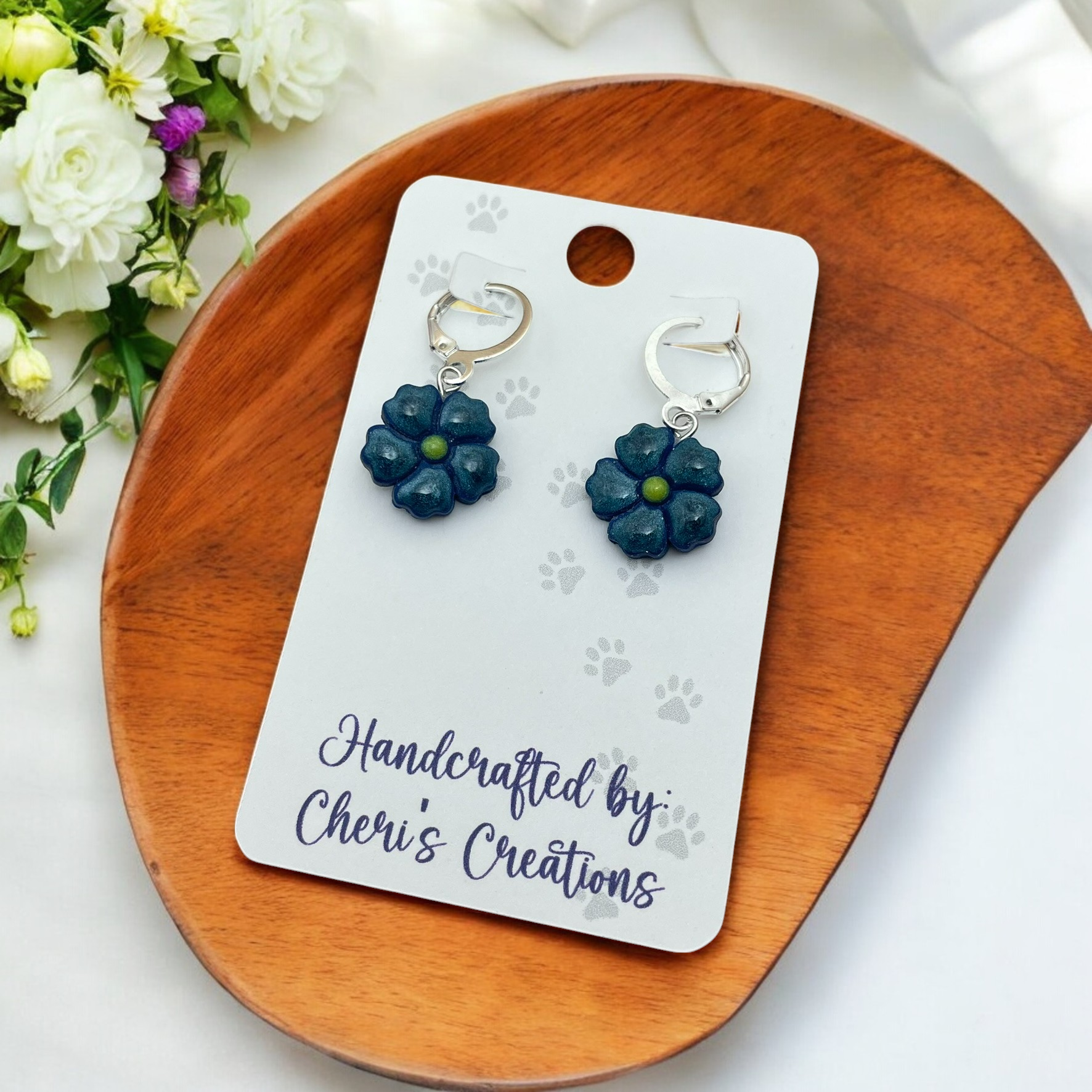 Add a touch of elegance and sophistication to your look with these handmade navy blue flower dangle earrings! Crafted from polymer clay, each earring features an intricate navy blue flower, beautifully shaped to create a bold yet refined design. The flower dangles gracefully from a stainless steel lever back hoop, ensuring both security and comfort.