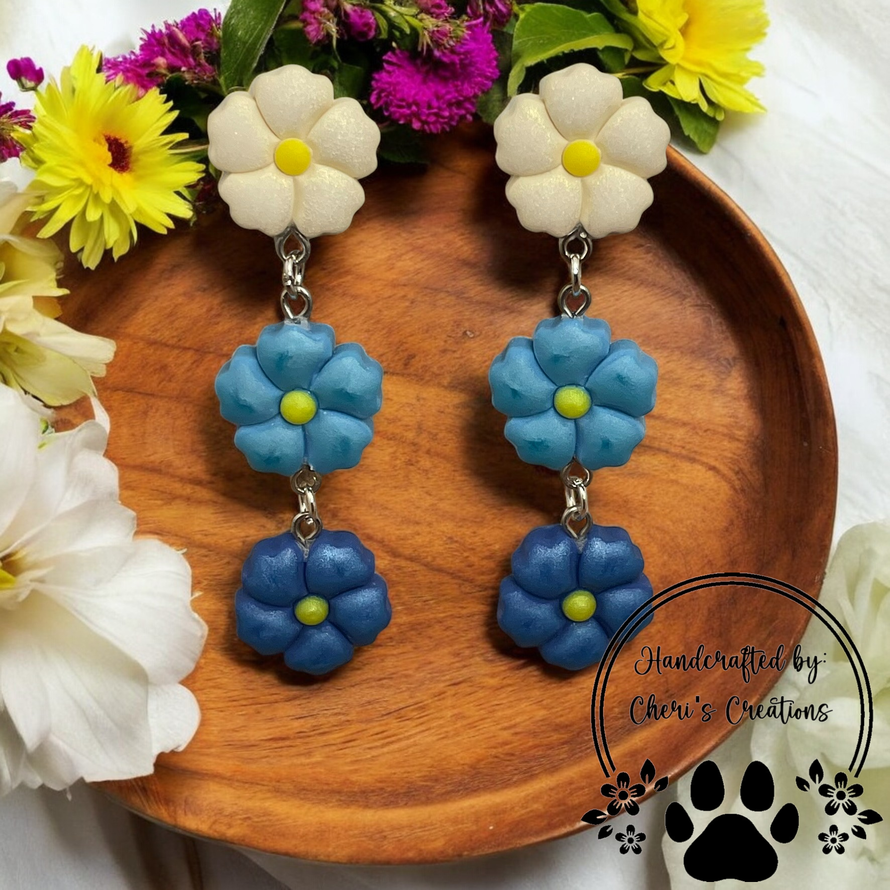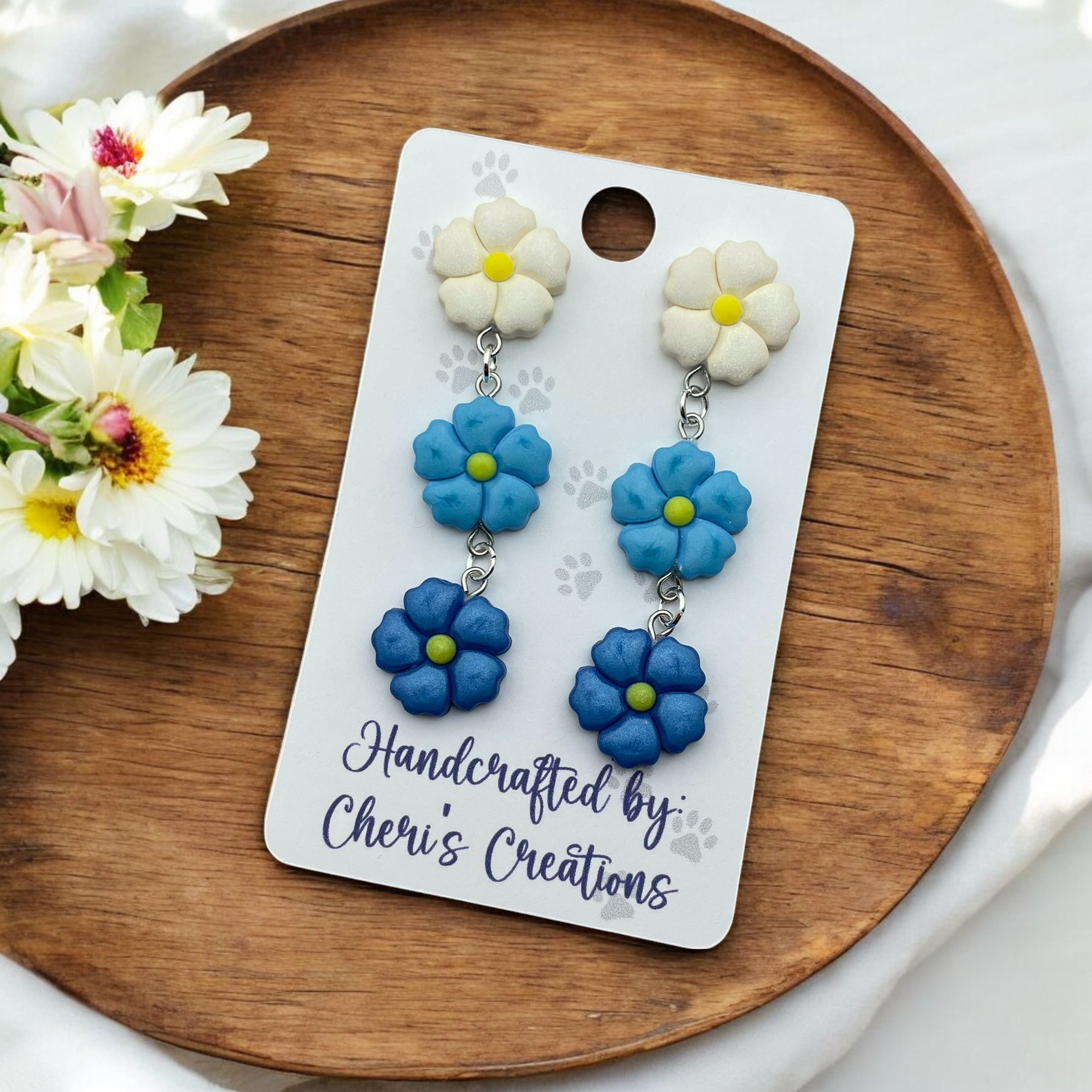 Bring a serene pop of color to your style with these handmade blue floral dangle earrings! Featuring three beautifully crafted flowers in varying shades of blue, these earrings create a soft yet striking look. The flowers are arranged to hang gracefully, adding a touch of nature’s elegance to any outfit. Attached to stainless steel stud posts, they offer a secure and comfortable fit.