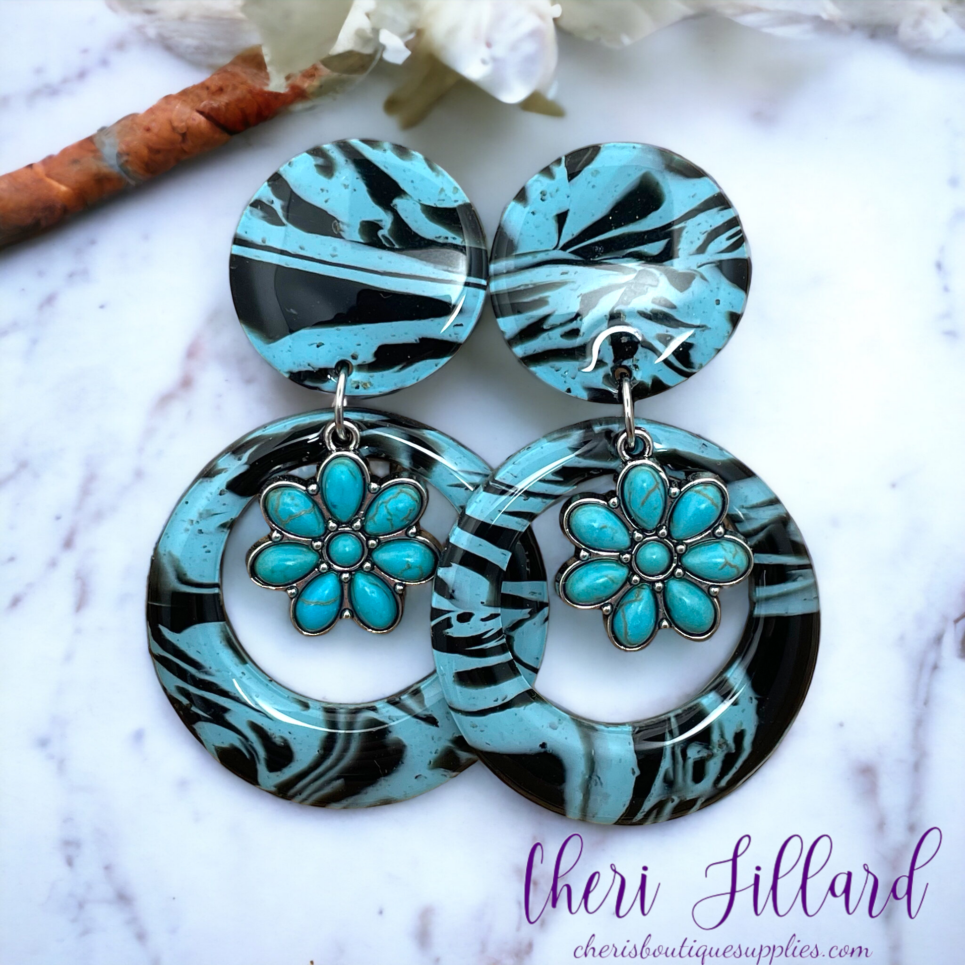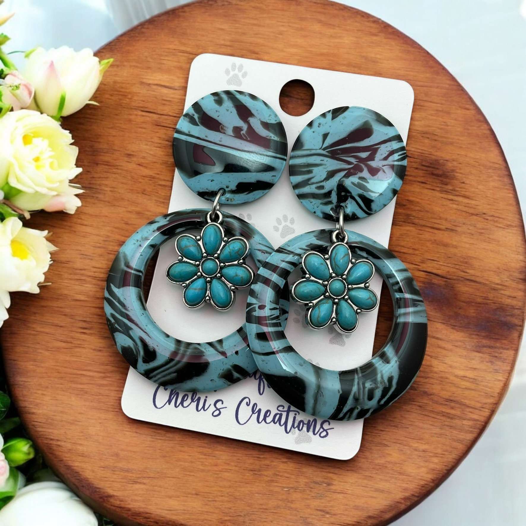 Embrace your free spirit with these charming boho-style handmade circle earrings! Each earring features a unique faux turquoise texture that captures the essence of natural stones, offering a vibrant pop of color and a rustic appeal. At the center of each circle, a delightful turquoise flower charm adds an extra touch of whimsy and femininity, making these earrings perfect for any bohemian-inspired outfit. Lightweight and comfortable, they are ideal for everyday wear or special occasions, allowing you to express your individuality effortlessly. Treat yourself or surprise a friend with these enchanting circle earrings that celebrate the beauty of nature and artistic craftsmanship!
