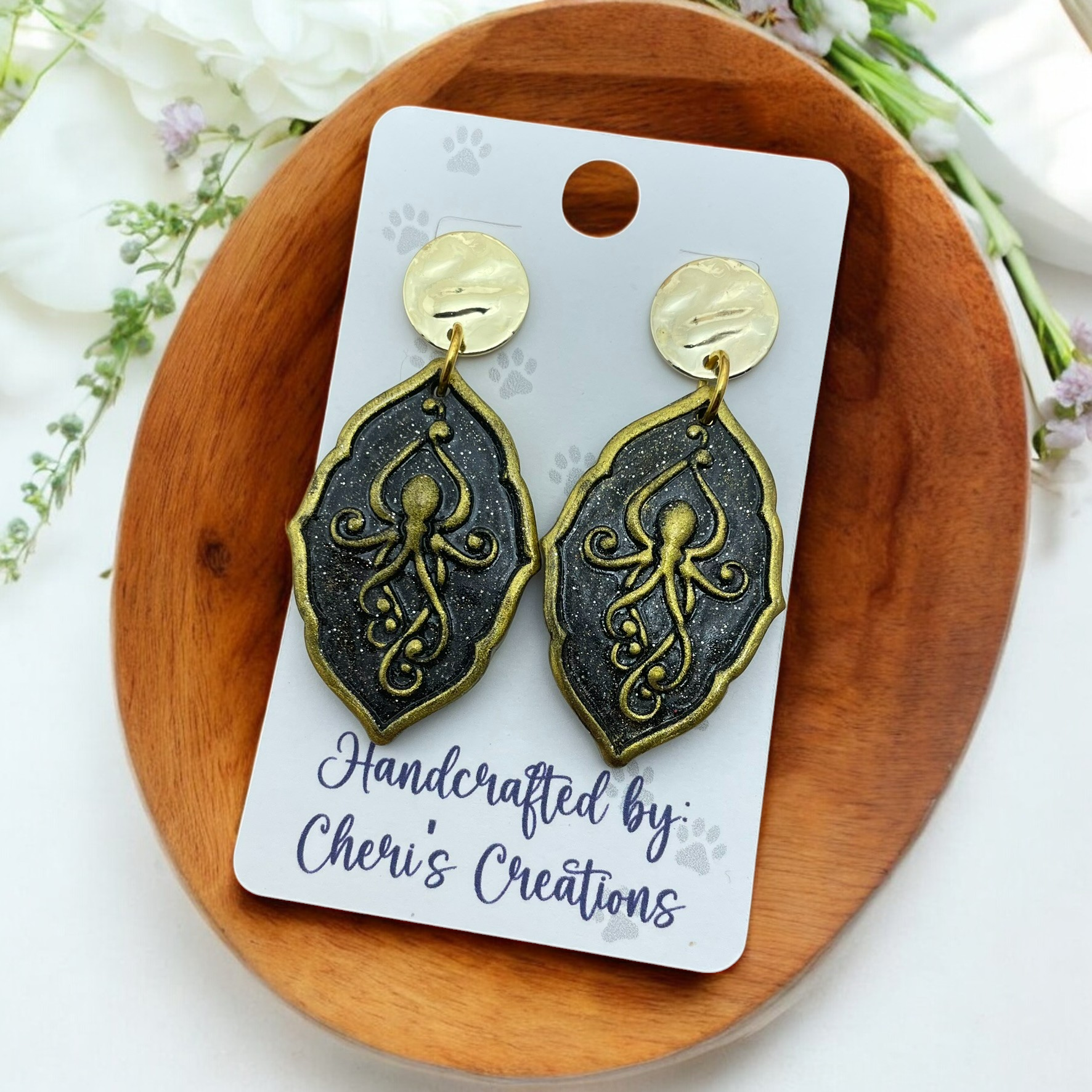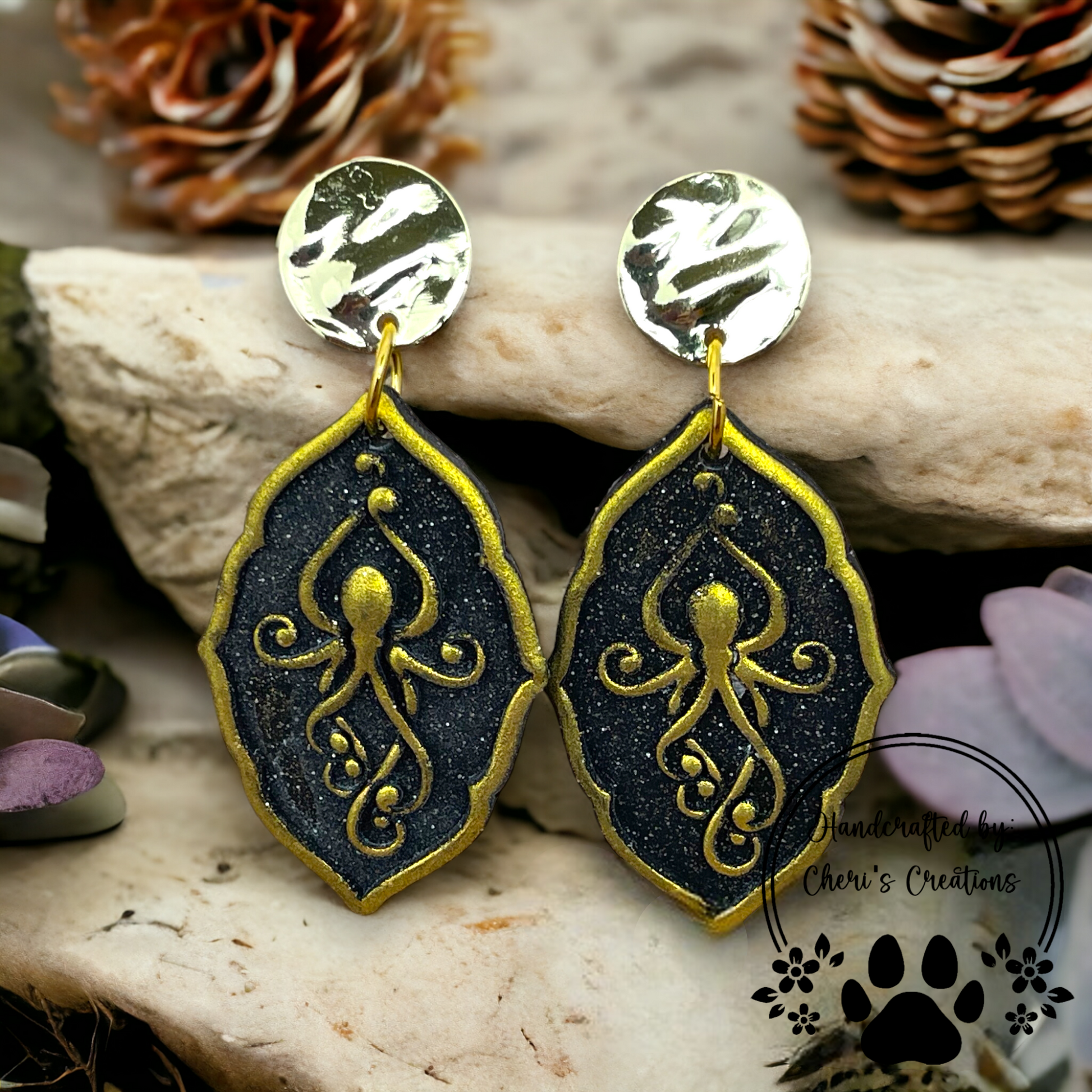 Make a bold statement with these striking handmade octopus dangle earrings! Crafted from polymer clay, each earring features a beautifully detailed gold octopus set against a sleek black background, creating an elegant and mysterious deep-sea vibe. Suspended from gold hammered studs, these earrings offer a unique blend of texture, contrast, and ocean-inspired charm.