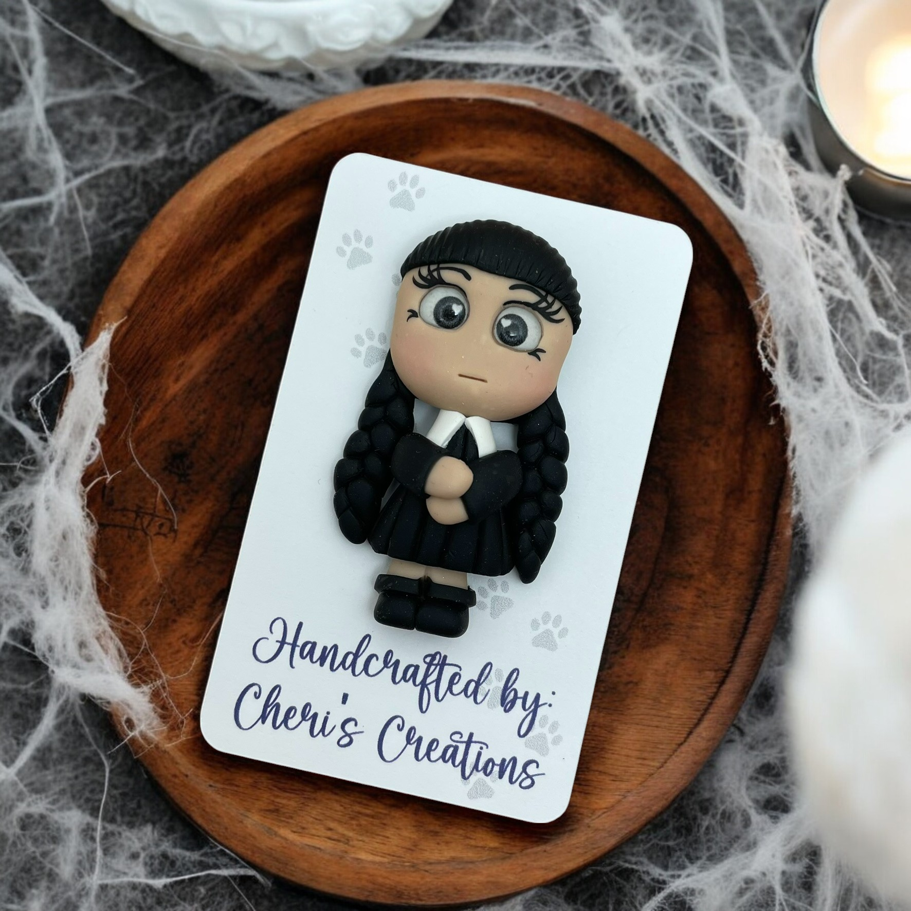 Add a touch of dark elegance to your crafts with this beautifully brooding gothic girl. Dressed in classic black with signature braided hair, she carries an air of mystery and charm that’s perfect for those who adore the spooky and strange. Whether you're crafting for bow centers, keychains, magnets, scrapbooking, and more, this piece is sure to bring a hauntingly sophisticated touch to any project.