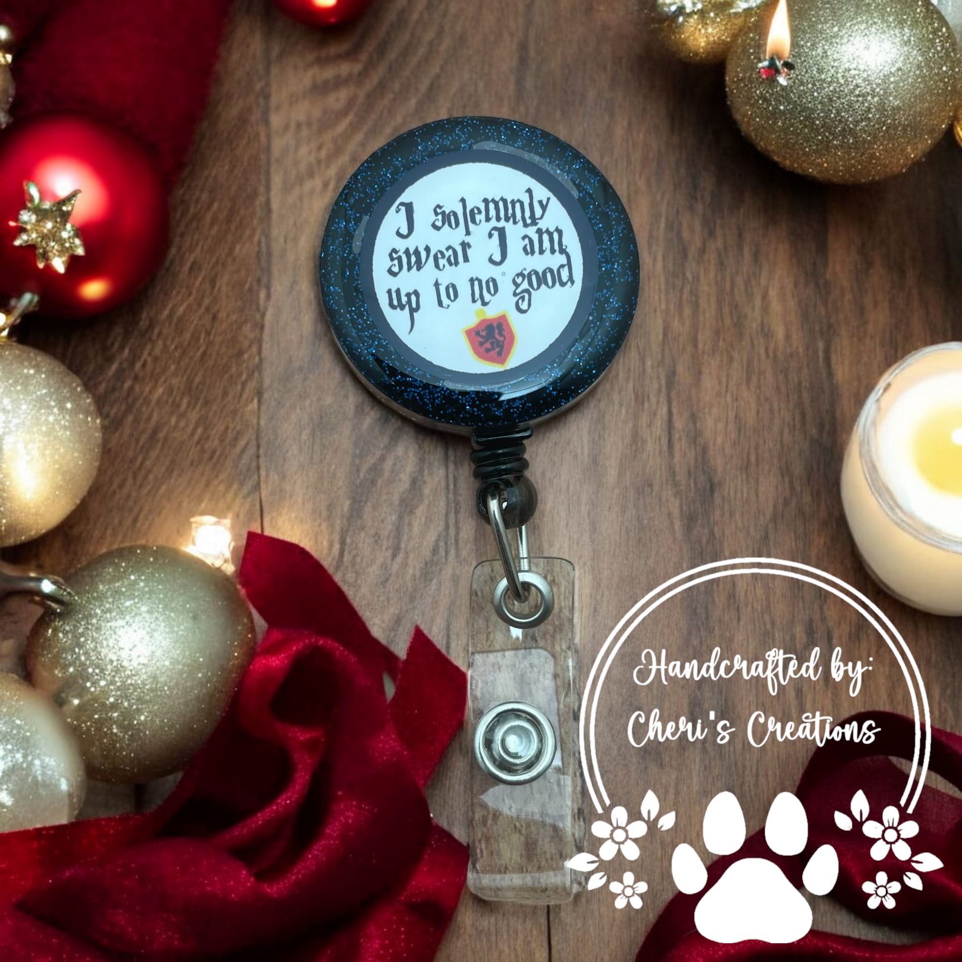 Add a dash of mischief to your day with this enchanting badge reel! Featuring a resin center with the iconic phrase 'I Solemnly Swear that I Am Up to No Good,' this accessory is perfect for those who embrace a bit of mystery and adventure. Stylish and sturdy, it’s an ideal way to express your playful side while keeping your badge secure at work, school, or anywhere you go. A whimsical accessory for anyone who loves a hint of magic in their daily routine!
