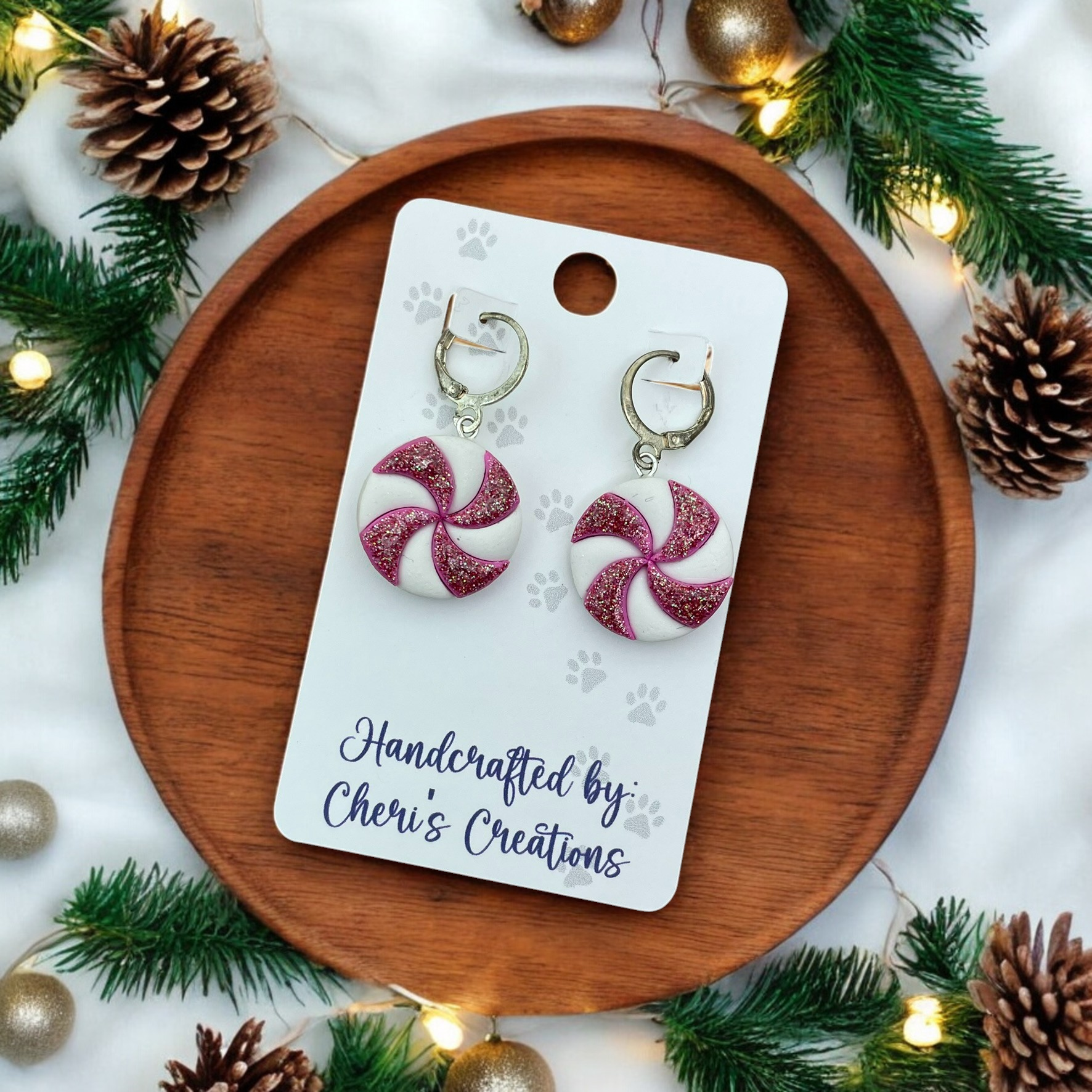 Add a playful pop of sweetness to your style with these handmade pink peppermint dangle earrings! Crafted from polymer clay, each earring showcases a delightful pink peppermint design with charming swirl details, perfect for adding a whimsical touch to any outfit. The earrings dangle from stainless steel lever back hoops, offering both comfort and security for all-day wear.