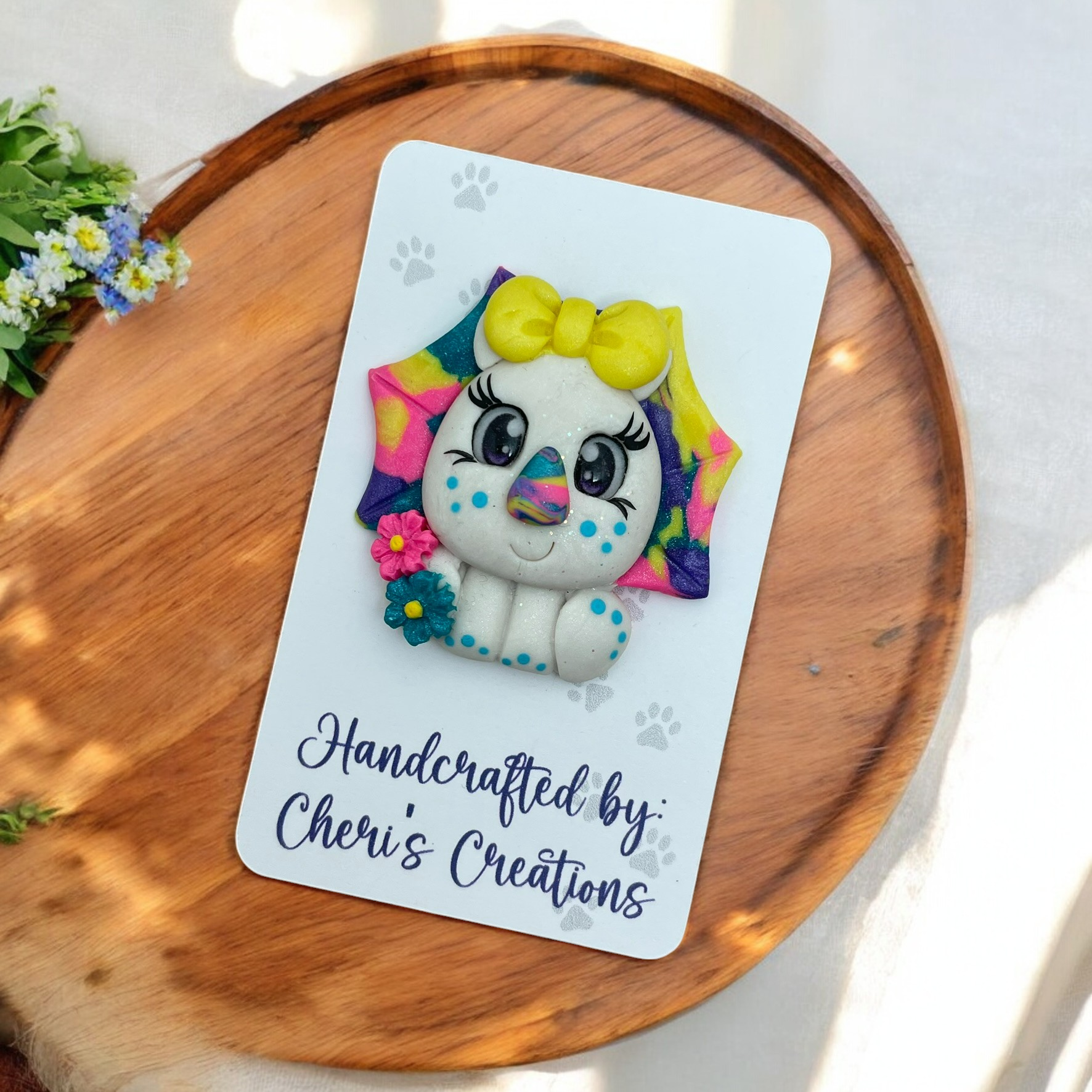 Each piece is expertly handcrafted, ensuring that every detail—from the triceratops' sweet expression to the vibrant rainbow hood—pops with personality. Since polymer clay is delicate, we recommend sealing it with resin or another protective coating if used for keychains or high-contact items.
