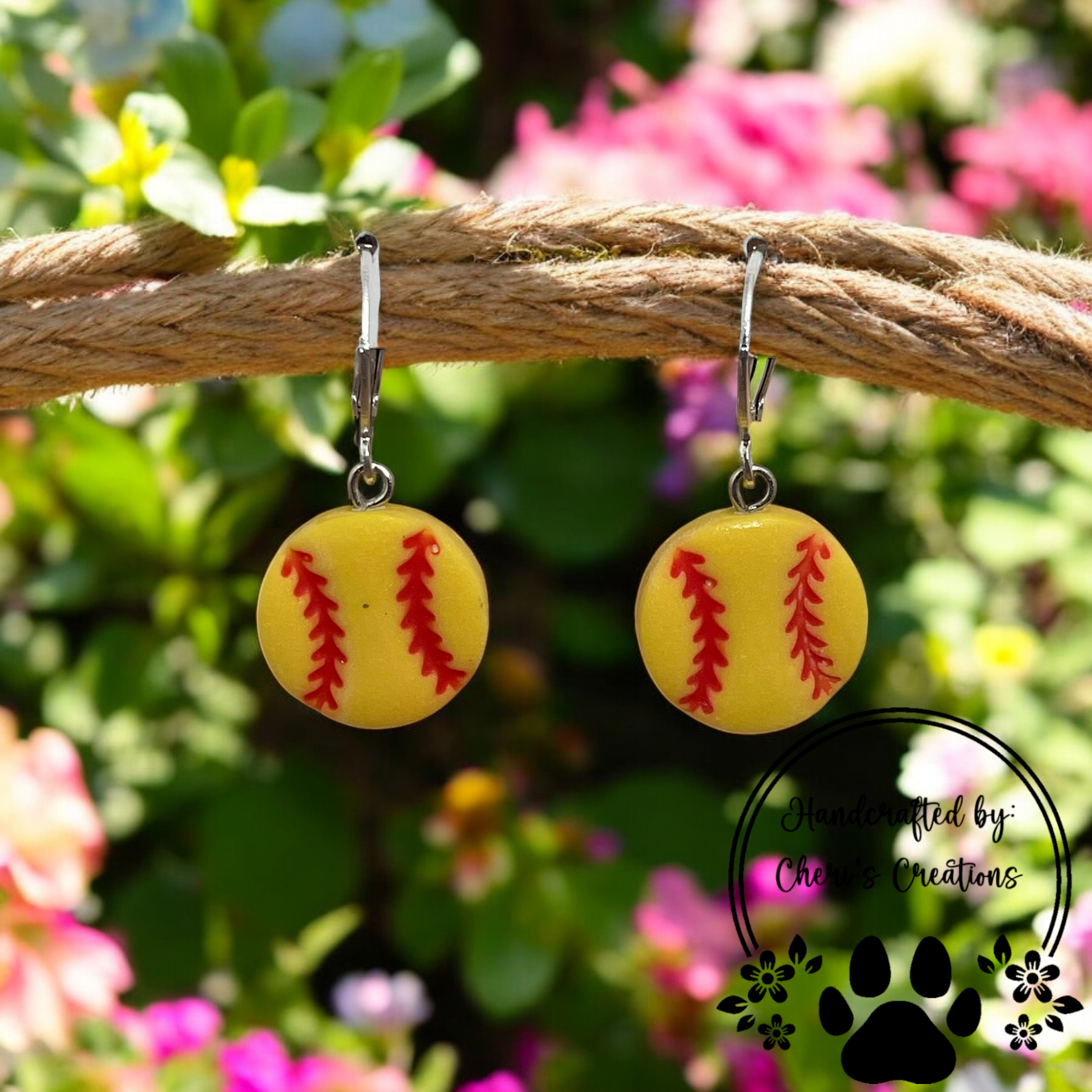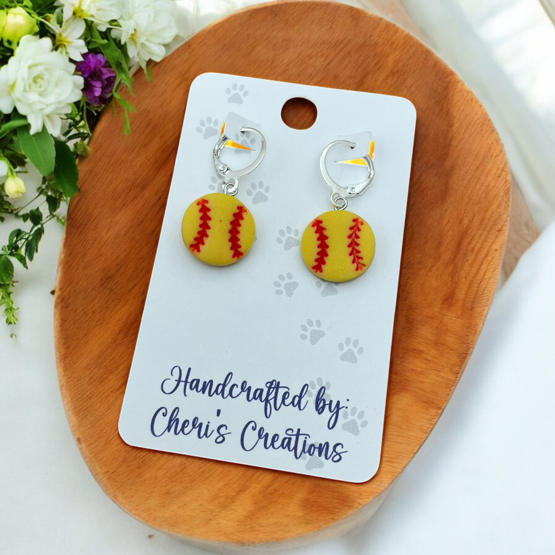 Show off your passion for the game with these handmade softball dangle earrings! Crafted from polymer clay, each earring features a detailed, miniature softball design, capturing the vibrant yellow color and red stitching that make the game so iconic. The earrings dangle gracefully from stainless steel lever back hoops, ensuring a secure and comfortable fit.
