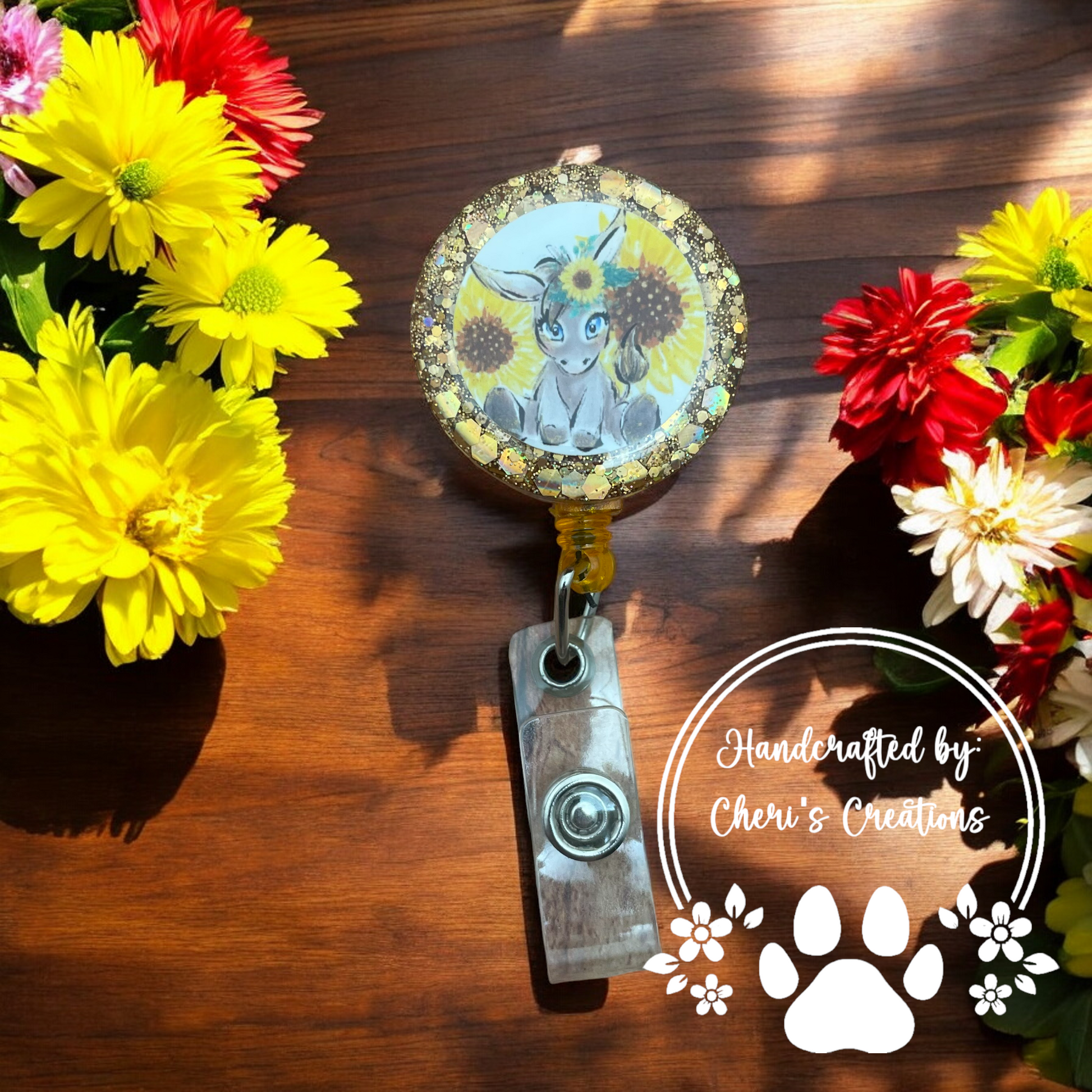 Brighten up your day with this adorable badge reel featuring a sweet, smiling donkey surrounded by vibrant sunflowers! The donkey's charming expression and the cheerful yellow sunflowers make this badge reel a perfect accessory for animal lovers and anyone looking to add a bit of sunshine to their daily routine. Made with durable materials, it’s designed to keep your badge secure while adding a touch of whimsy to your work or school attire. Clip it onto your scrubs, lanyard, or ID holder, and let this cute little friend bring a smile to everyone you meet!