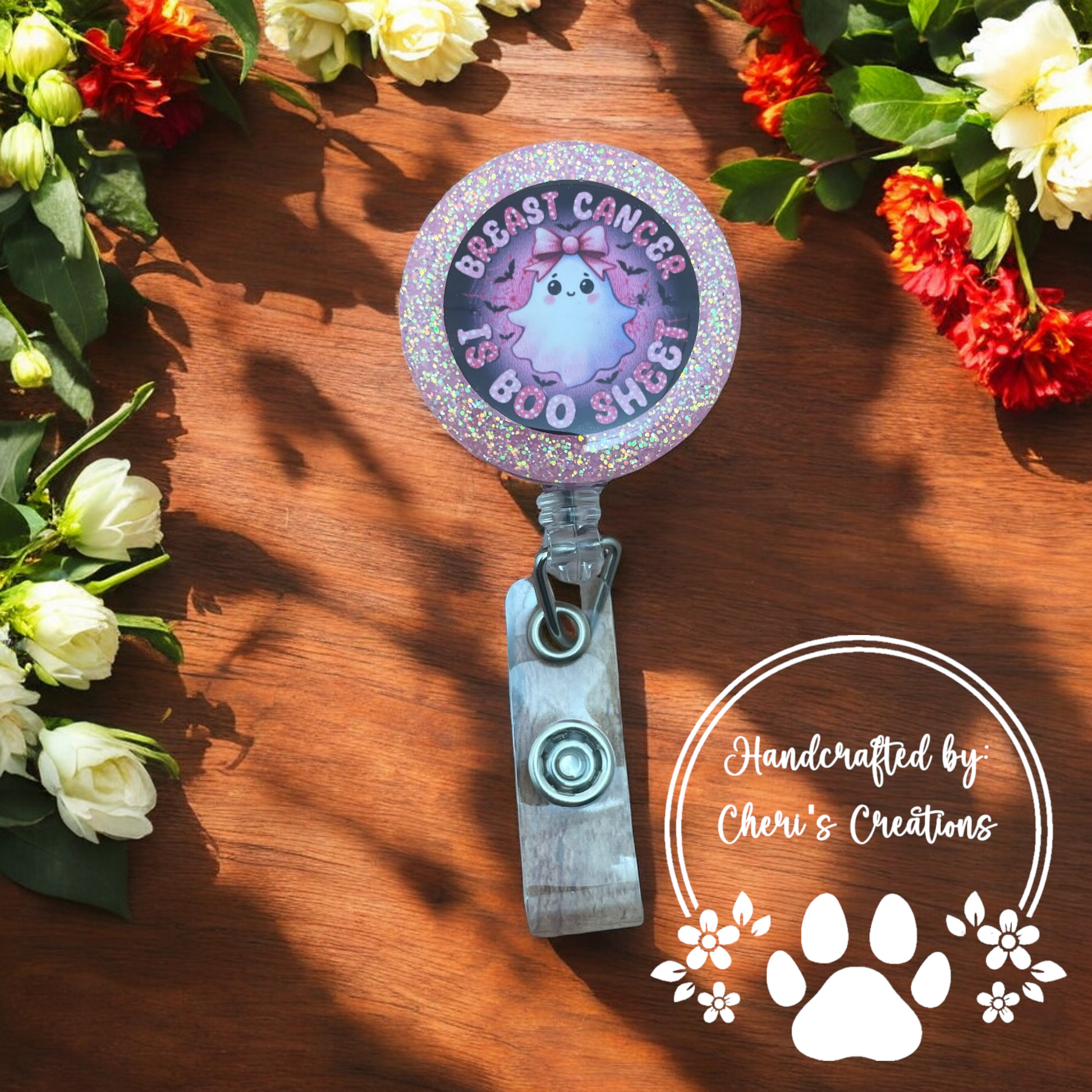 Show your support with a fun twist! This badge reel features a charming, hand-crafted resin center with an adorable ghost and the phrase 'Breast Cancer is Boo Sheet.' Perfect for October or year-round awareness, this accessory adds a touch of humor to a serious cause. The friendly ghost design keeps things lighthearted, reminding everyone of the importance of awareness and support. Durable and convenient, it’s a unique way to spread positivity and raise awareness at work, school, or anywhere you go!
