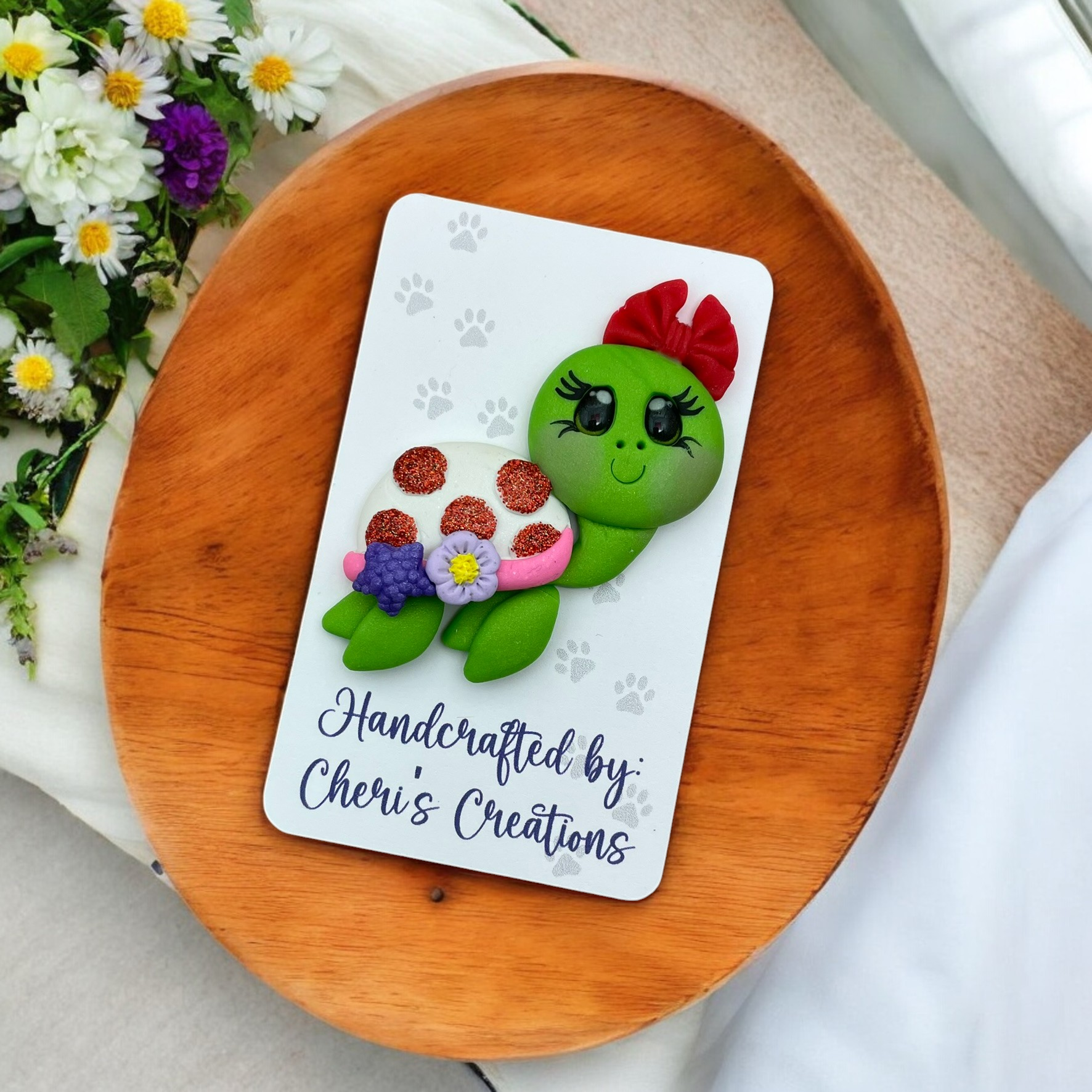 This adorable handmade turtle embellishment is full of charm, featuring a sweet shell decorated with red spots and delicate flowers! Perfect for adding a whimsical, nature-inspired touch to bow centers, keychains, magnets, scrapbooking, and more, this little turtle is ready to bring joy to your creative projects.
