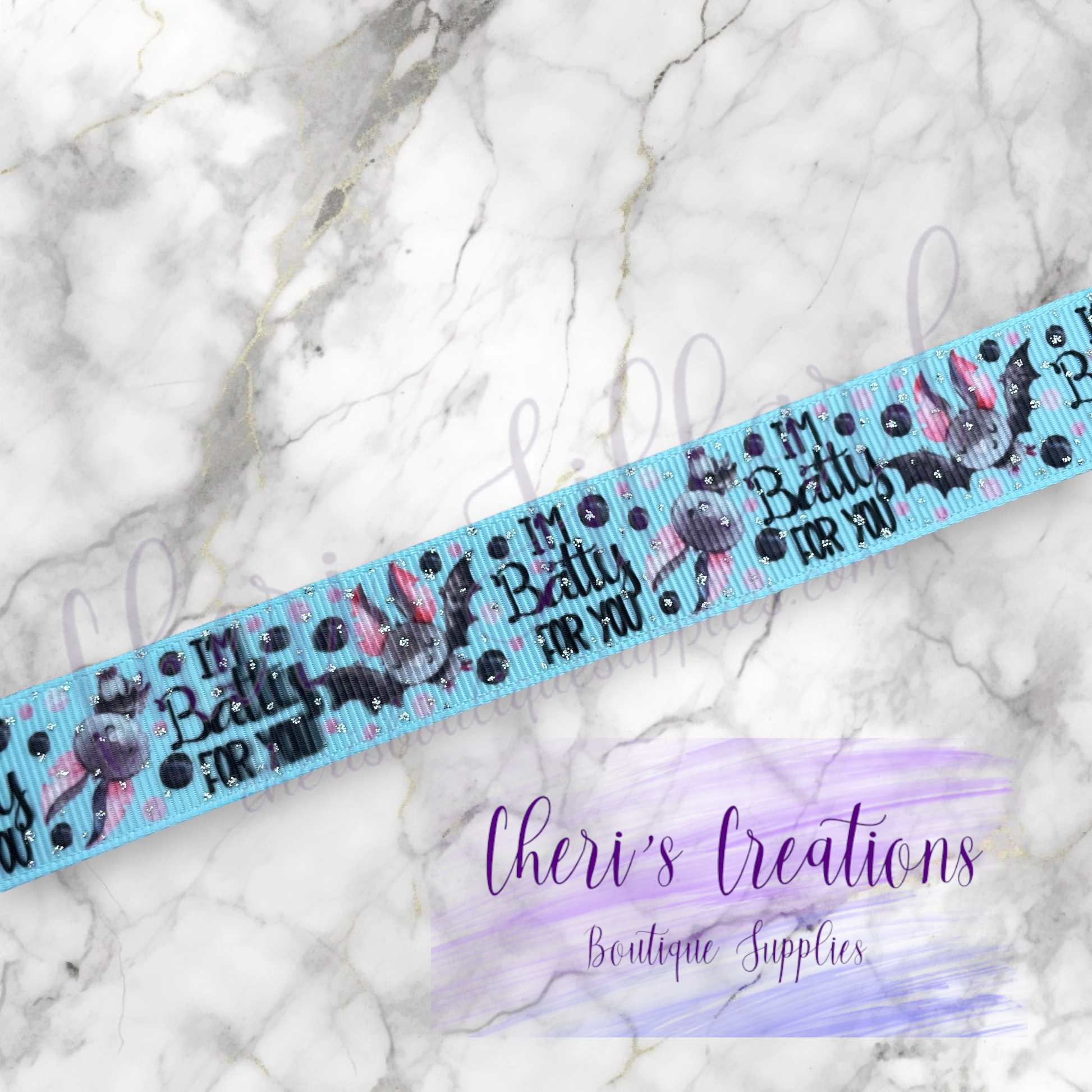 This adorable grosgrain ribbon features a cute bat theme with the sweet and playful phrase "I'm Batty for You"—perfect for Valentine’s Day, Halloween, or just because! Surrounded by charming little bats and fun design elements, this ribbon is sure to bring a smile to any project.