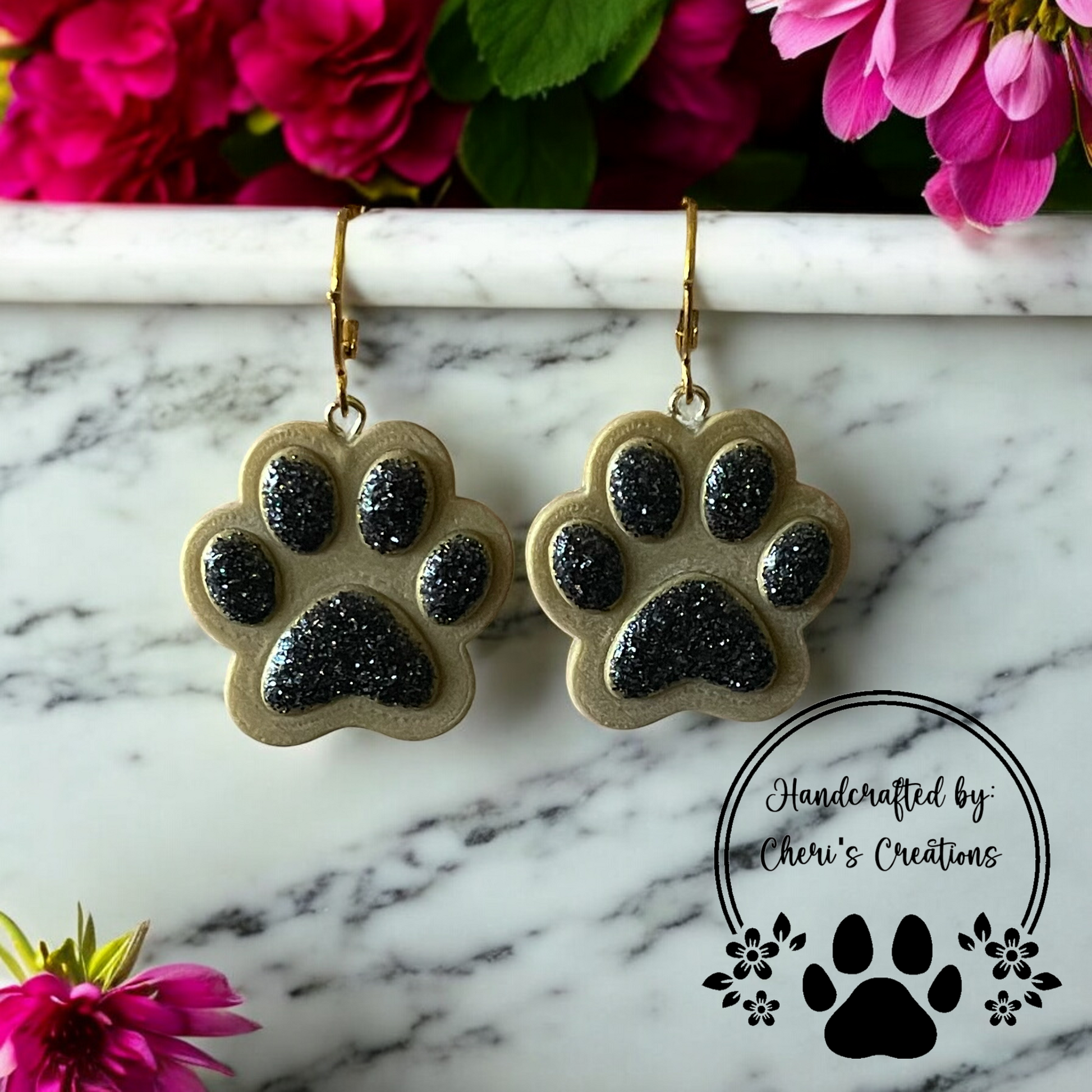 Black & Gold Paw Prints Polymer Clay Dangle Earrings