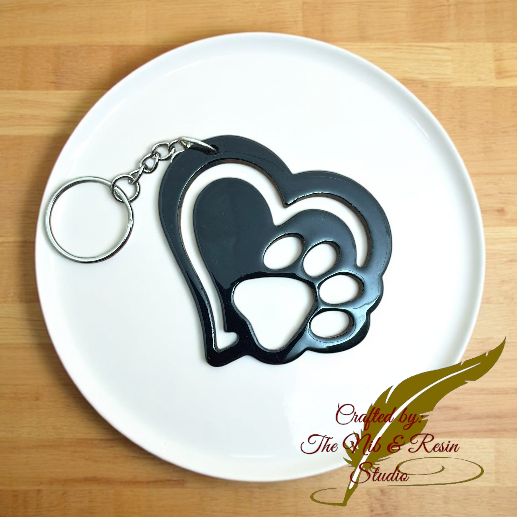 Honor the unconditional love of a furry companion with this handmade resin keychain, crafted in the shape of a heart with a paw print cut-out. Finished with a sleek black mica shimmer, this keychain offers a timeless, elegant look with just the right touch of sparkle.