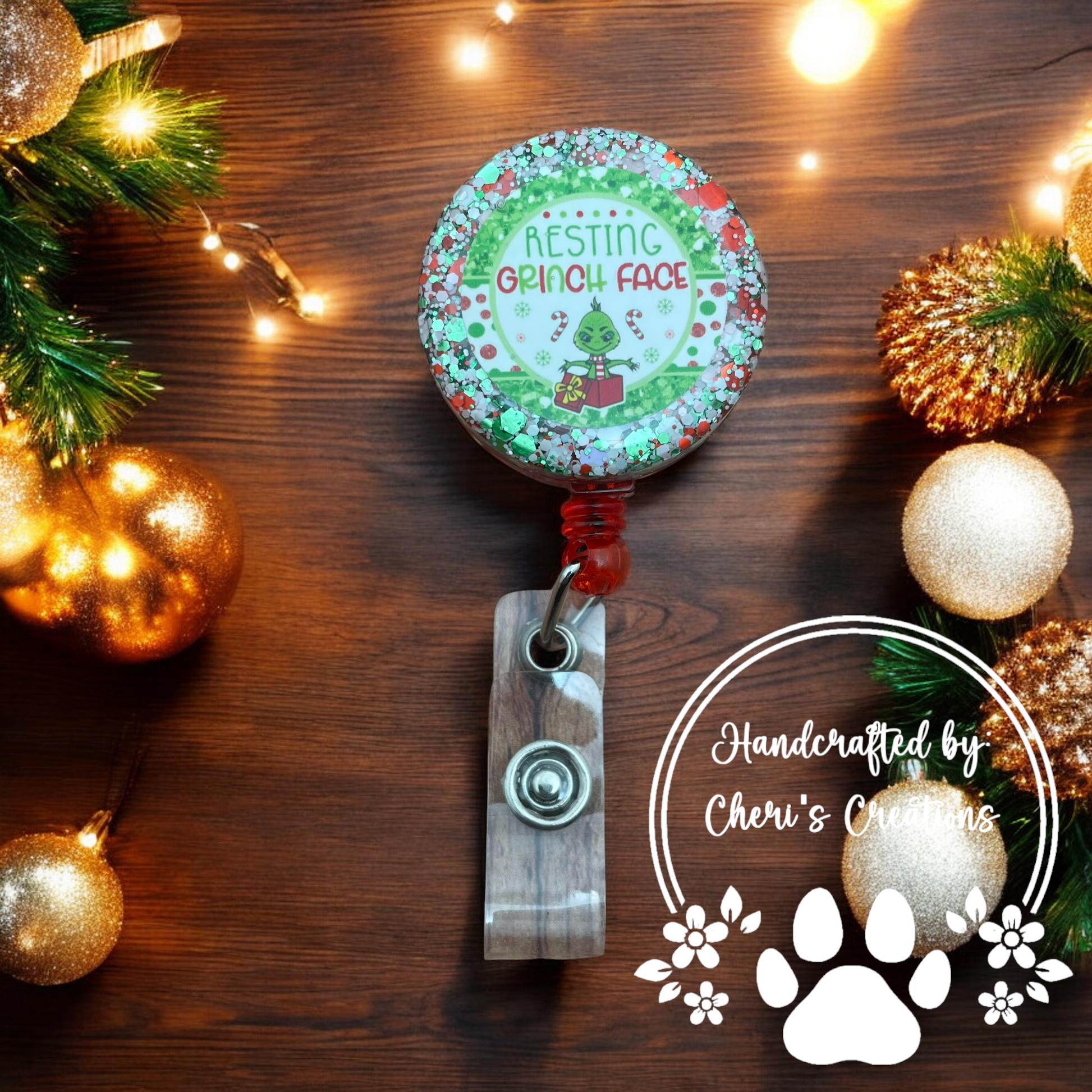 Add a bit of sassy holiday spirit to your day with this festive badge reel! Featuring a playful green face with a mischievous smirk and the phrase 'Resting Grinch Face,' this reel is perfect for anyone who loves a little holiday humor. The high-quality resin center adds durability, while the cheeky design lets everyone know your holiday vibes—cute, clever, and just a bit cranky. A fun accessory to spread smiles and laughs at work, school, or anywhere you need to flash your ID!