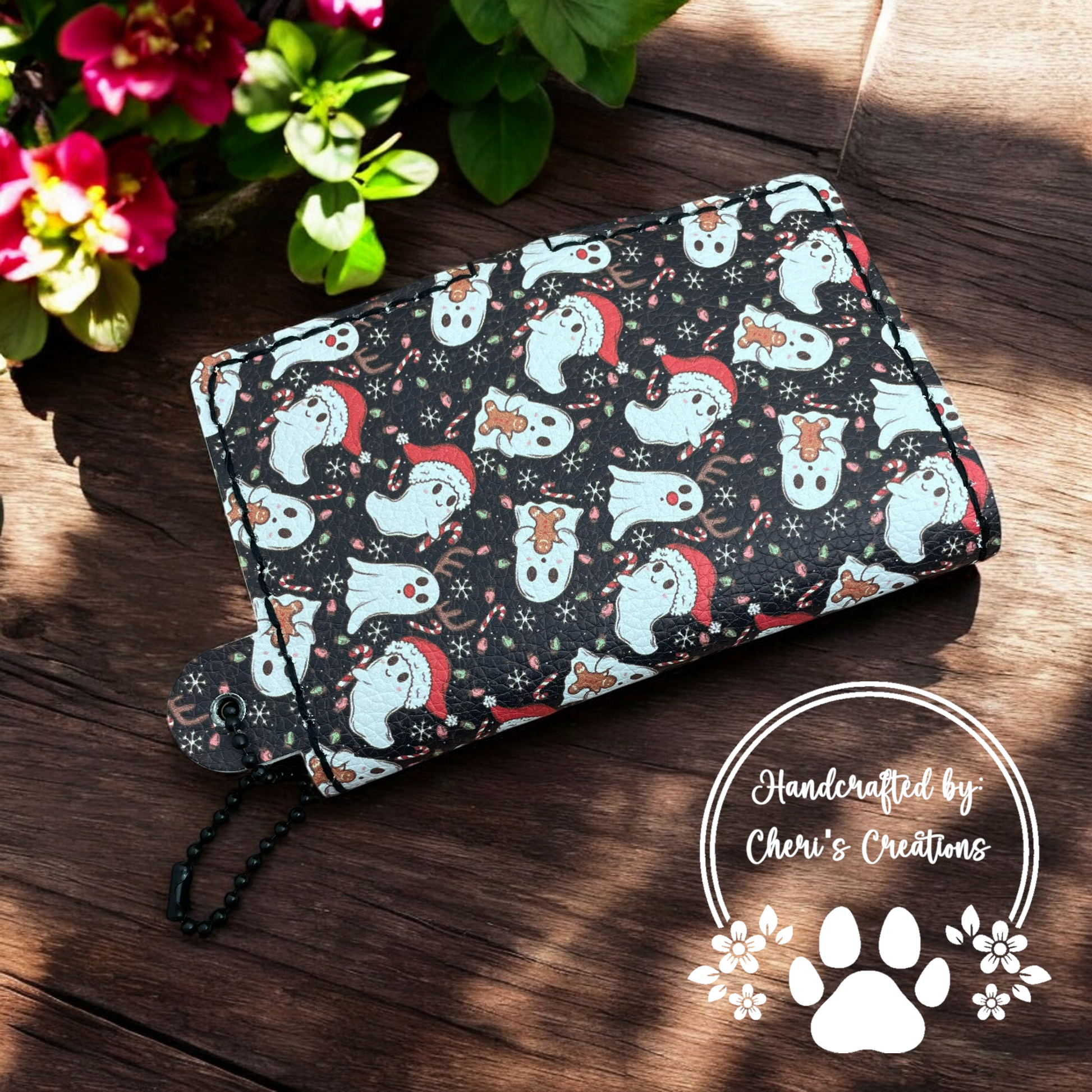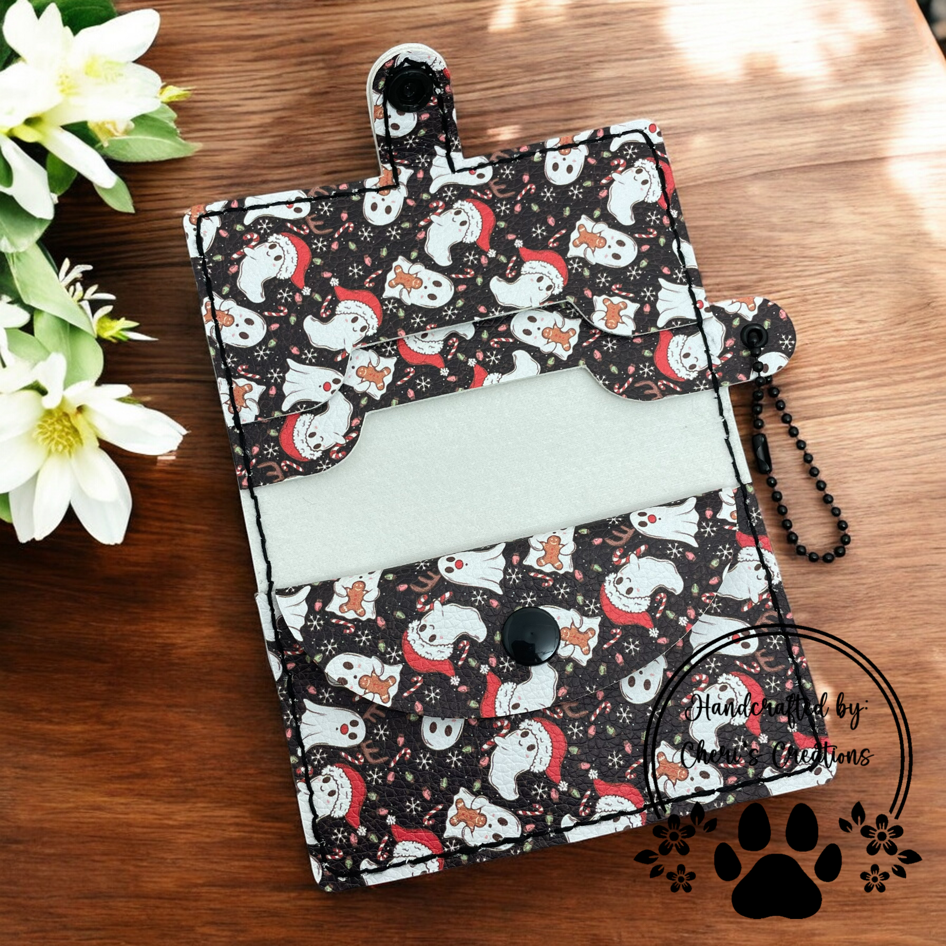This handmade faux leather coin and card wallet features an adorable Christmas ghost design, blending spooky charm with festive holiday cheer! The playful ghosts are dressed in Santa hats and surrounded by holiday accents, making this wallet a fun and unique accessory for the season.