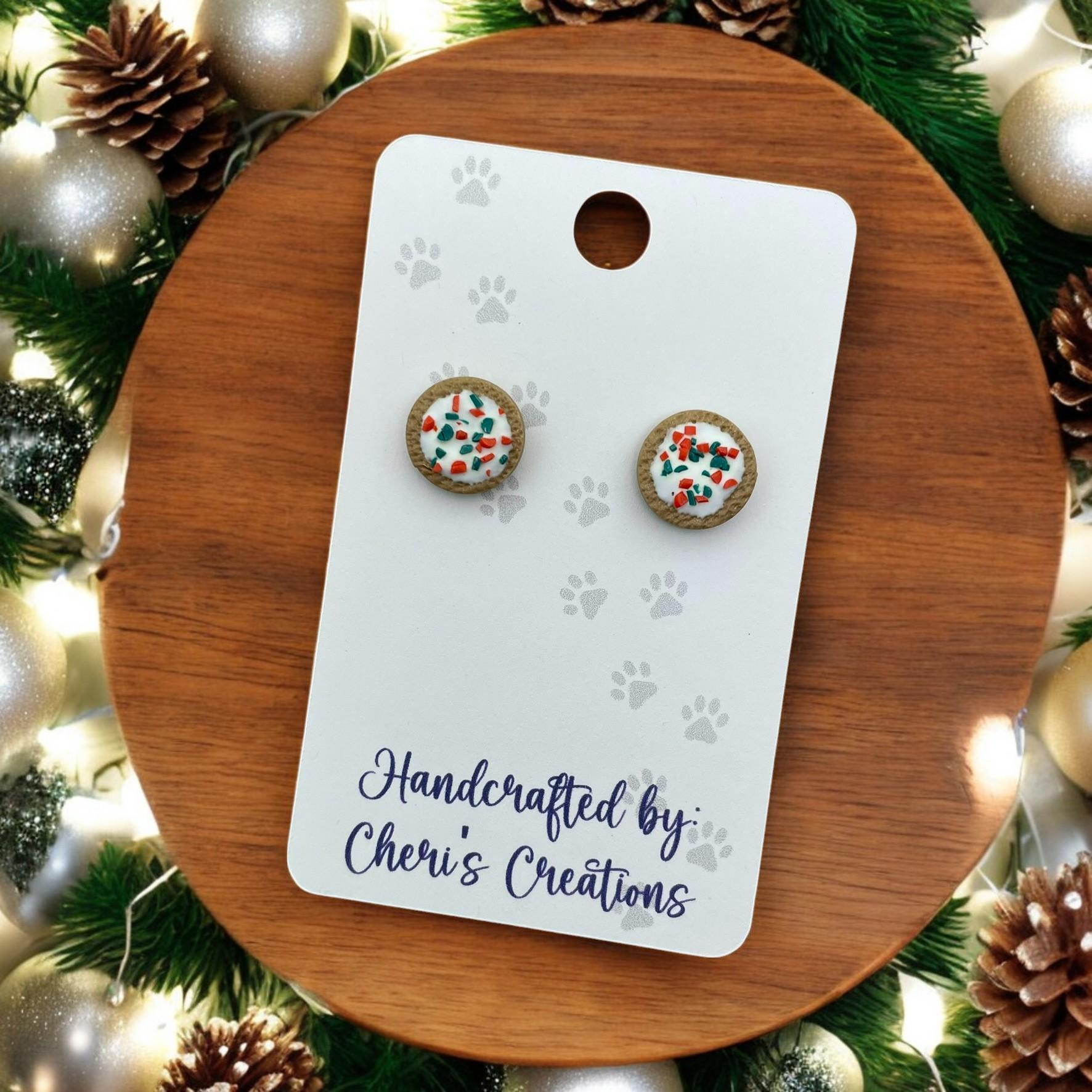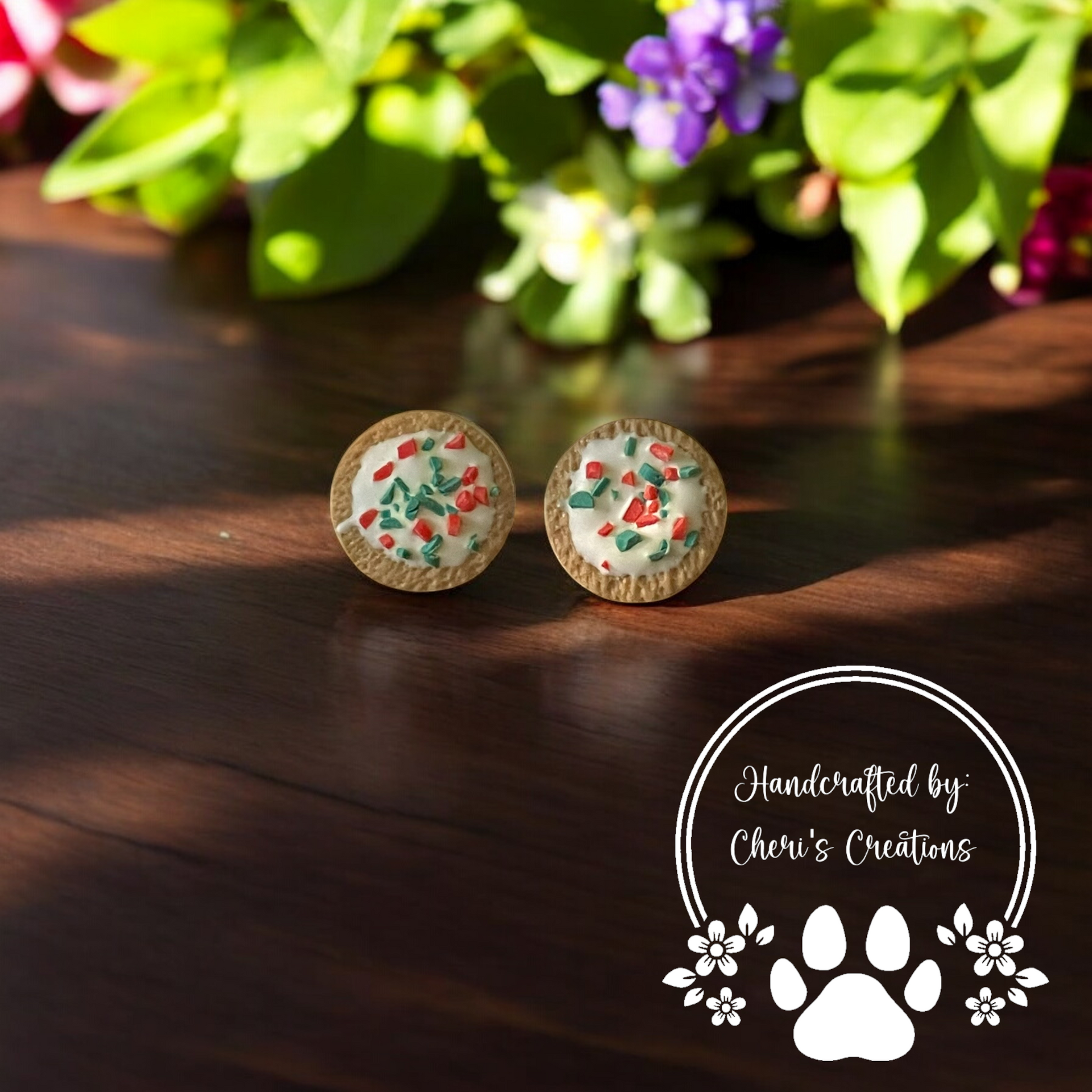 Celebrate the holiday spirit with these adorable handmade Christmas cookie stud earrings! Each earring features a delightful cookie design topped with a luscious layer of white icing and decorated with vibrant red and green sprinkles, bringing a touch of festive cheer to your jewelry collection. These charming studs are perfect for adding a whimsical accent to your holiday outfits or for gifting to a fellow cookie lover. Lightweight and comfortable, they are designed for all-day wear, allowing you to showcase your love for festive treats in style. Treat yourself or surprise a friend with these delightful Christmas cookie studs that capture the sweetness of the season!