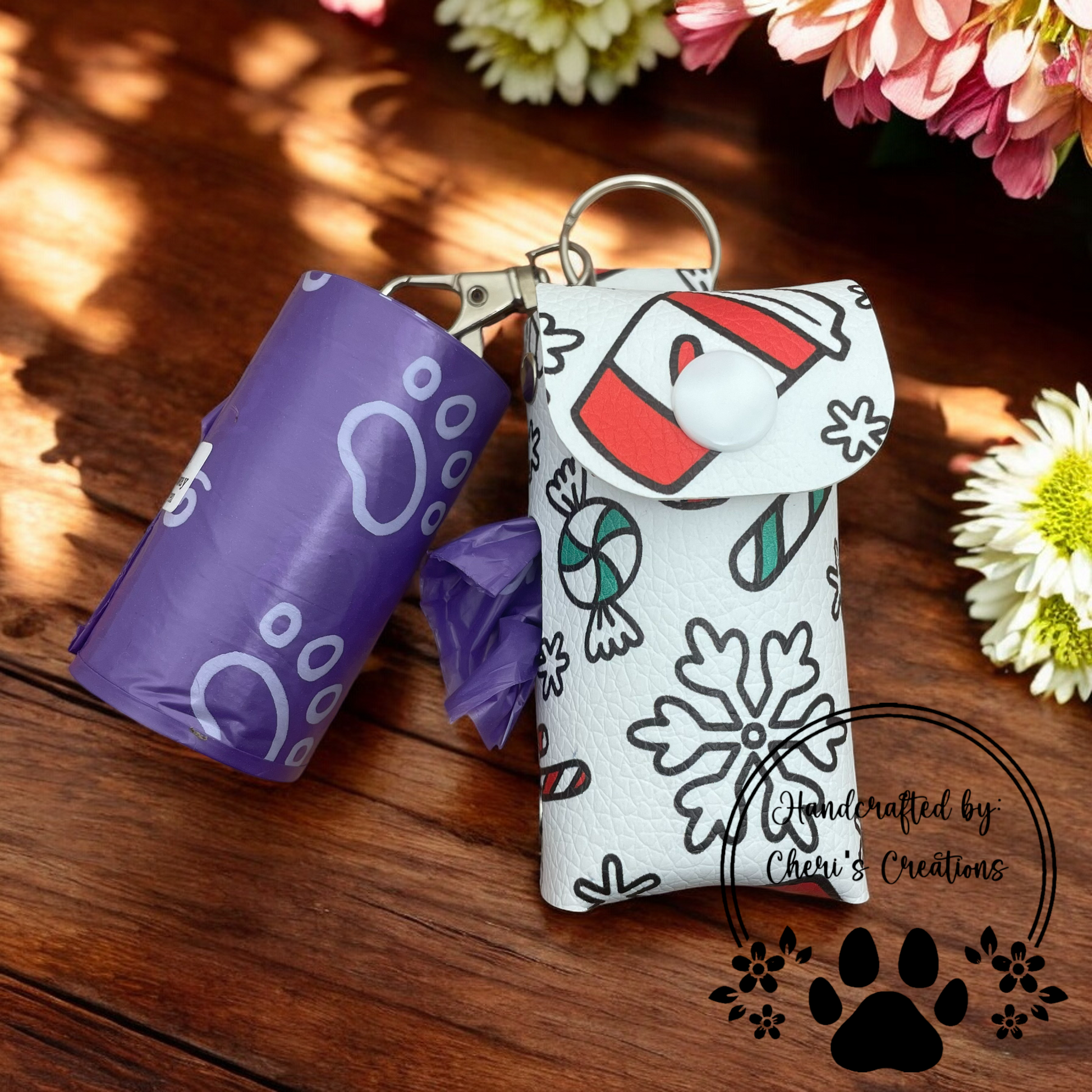 Get festive this holiday season with our charming doggy poo pouch featuring a delightful Christmas treats design! Adorned with festive illustrations of holiday cookies, candy canes, and other seasonal goodies, this pouch brings holiday cheer to your walks. Designed to hold waste bags securely while keeping them easily accessible, it includes a sturdy snap closure and a convenient clip for attaching to leashes or bags. Perfect for pet parents who want to spread some holiday spirit while keeping things practical during their winter outings!