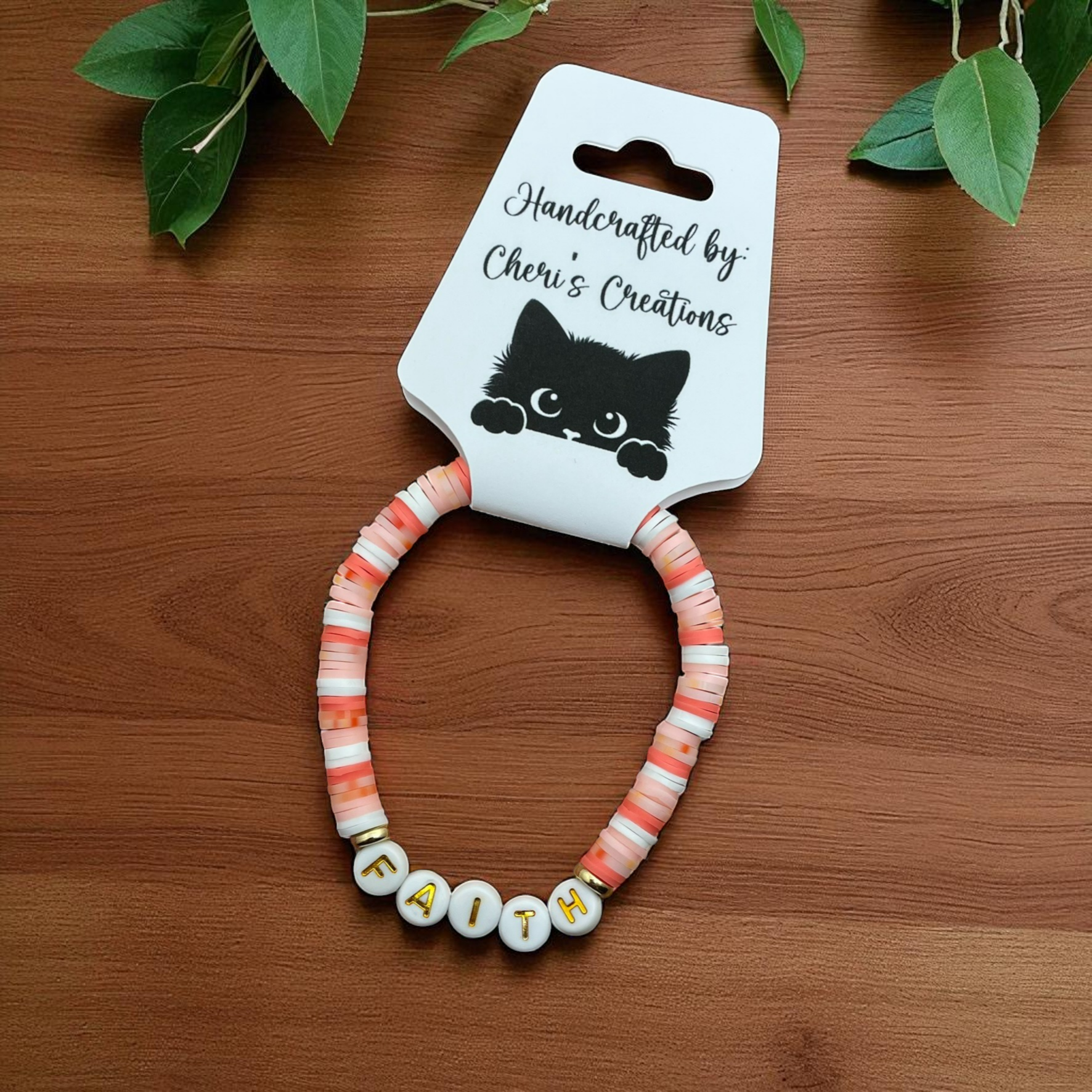 Coral Heishi Bead Bracelet – Handmade Stretch Bracelet with FAITH, HOPE, or LOVE