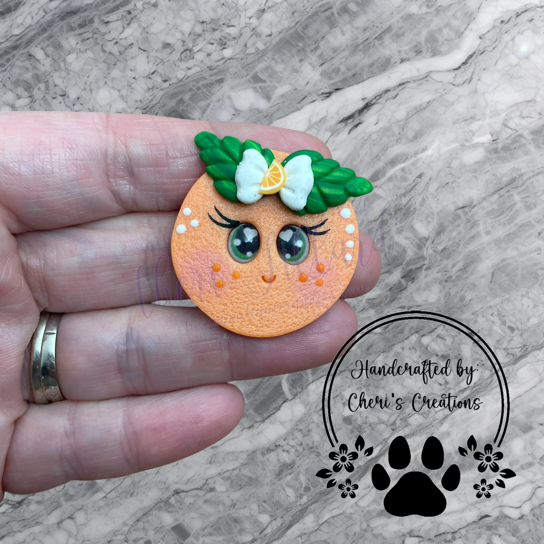 This handmade polymer clay embellishment features an adorable bright orange with a cheerful smile and charming citrus details. Its vibrant color and playful design make it a sweet addition to your creative projects—whether you're crafting hair bows, decorating planners, making keychains, or adding fun flair to scrapbooks and magnets.