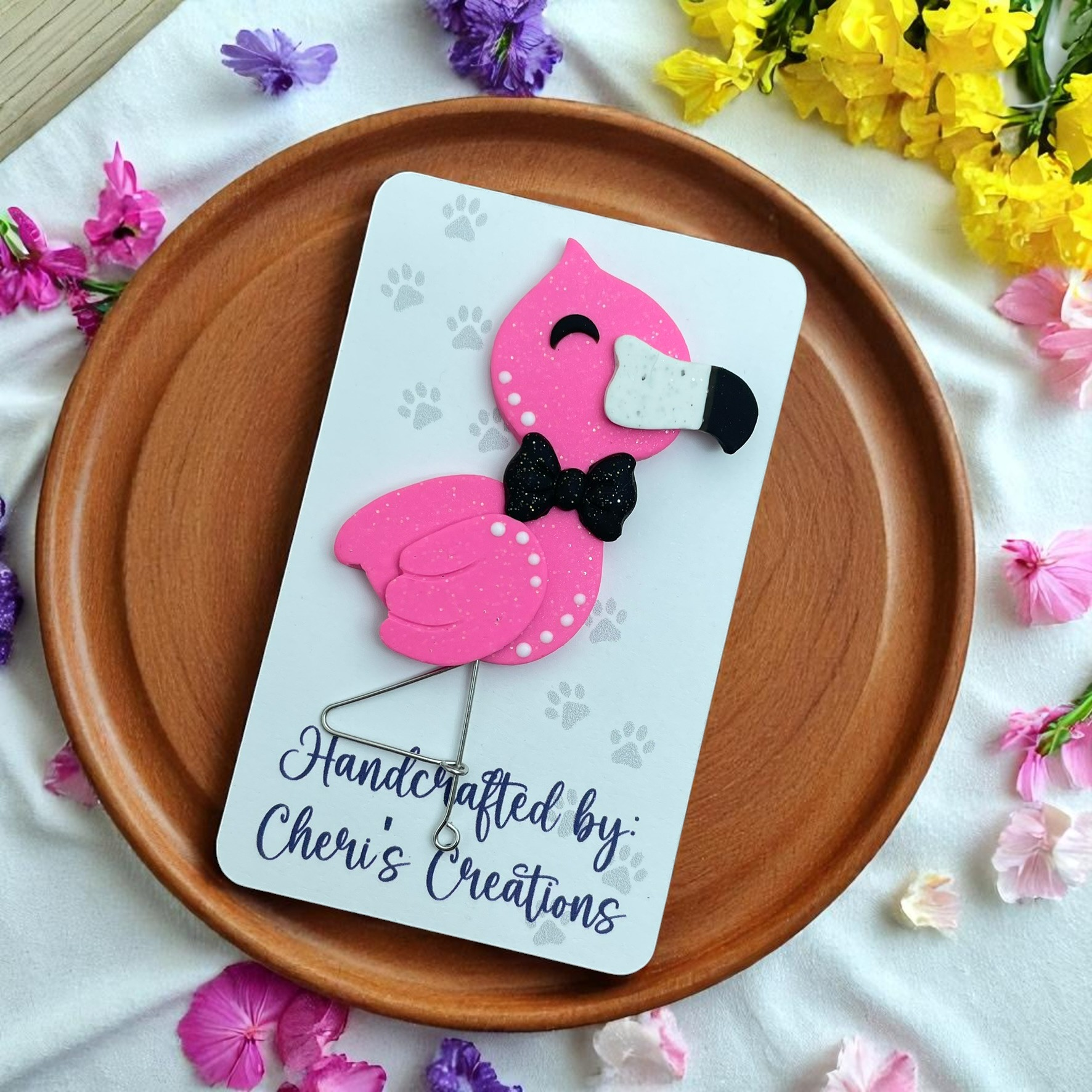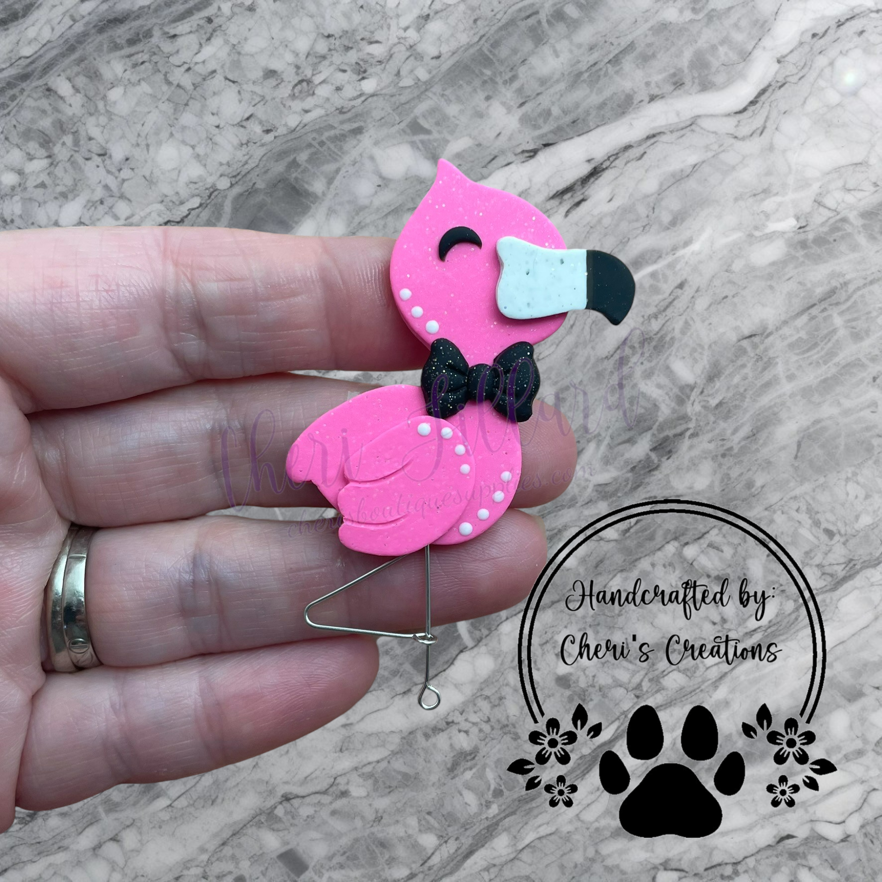 This handmade polymer clay embellishment features an elegant pink flamingo styled with a sharp black bowtie, giving it a fun and classy personality. With its graceful stance and vibrant coloring, this flamingo brings charm and character to your creative projects—whether you're designing hairbows, decorating planners, or adding flair to your keychains and magnets.