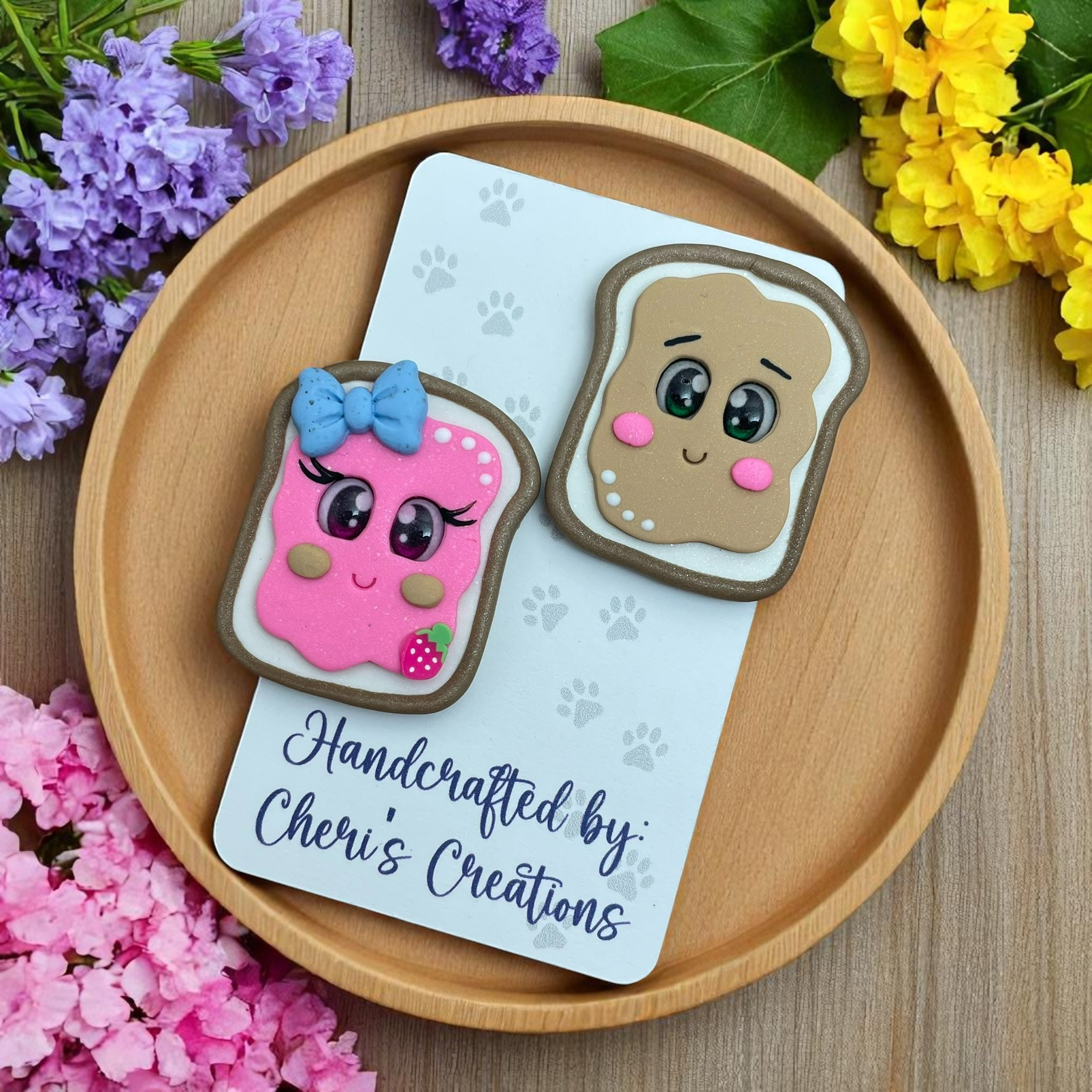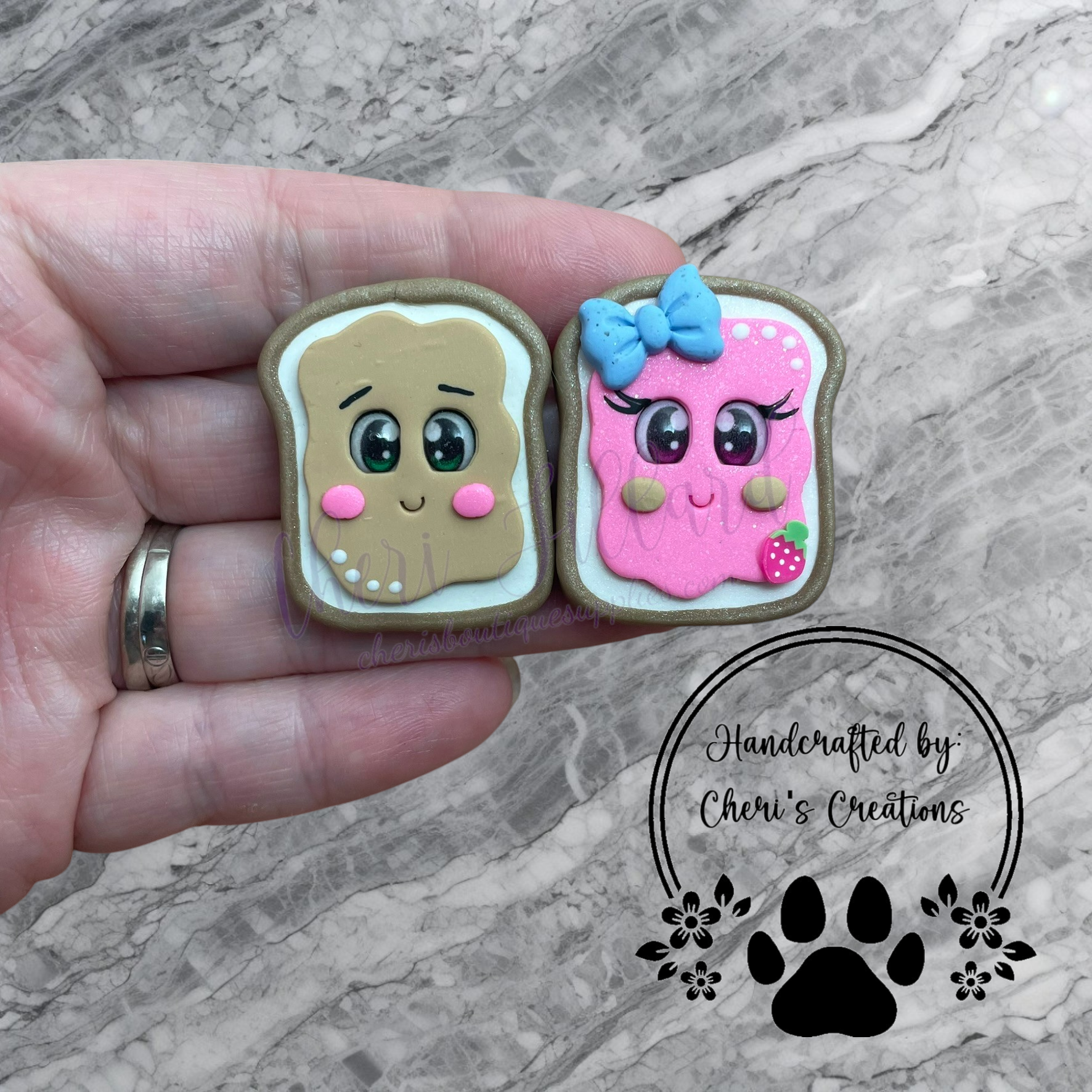 This handmade polymer clay embellishment features an irresistibly cute peanut butter and strawberry jelly set, designed to look like smiling slices of sandwich bread. One slice is topped with creamy peanut butter, while the other features a vibrant strawberry jelly with a mini strawberry for extra charm. With sweet expressions and playful detailing, this duo adds a nostalgic and whimsical touch to your crafting projects!