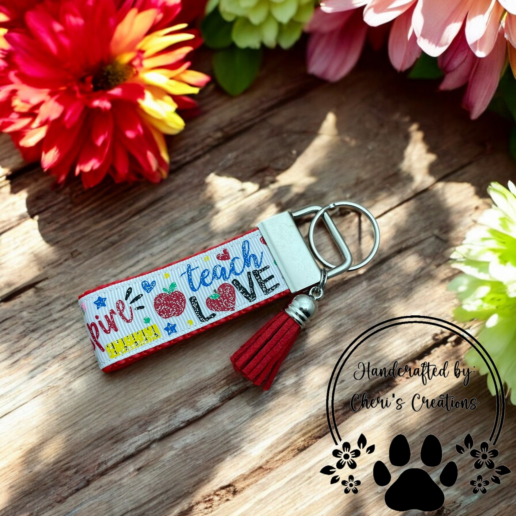 Handmade TEACH LOVE INSPIRE Ribbon Keychain – Teacher Keychain – Inspirational Teacher Gift – Grosgrain Ribbon Keychain – Motivational Keychain for Teachers