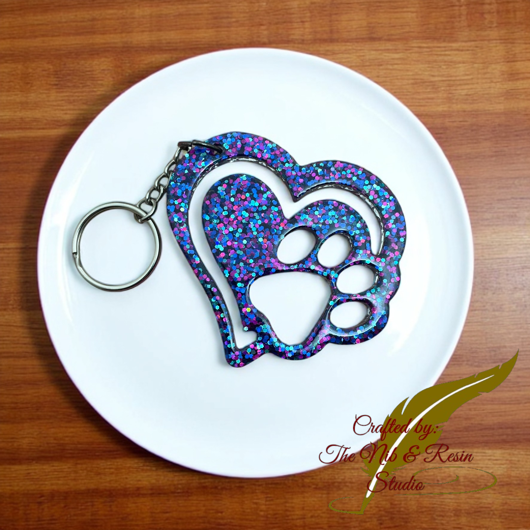 Celebrate your love for furry friends with this handmade resin keychain, featuring a sweet heart shape with a paw print cut-out. Filled with a magical mix of "purple, pink, & blue glitter blend", this keychain sparkles with personality and pet-loving charm.