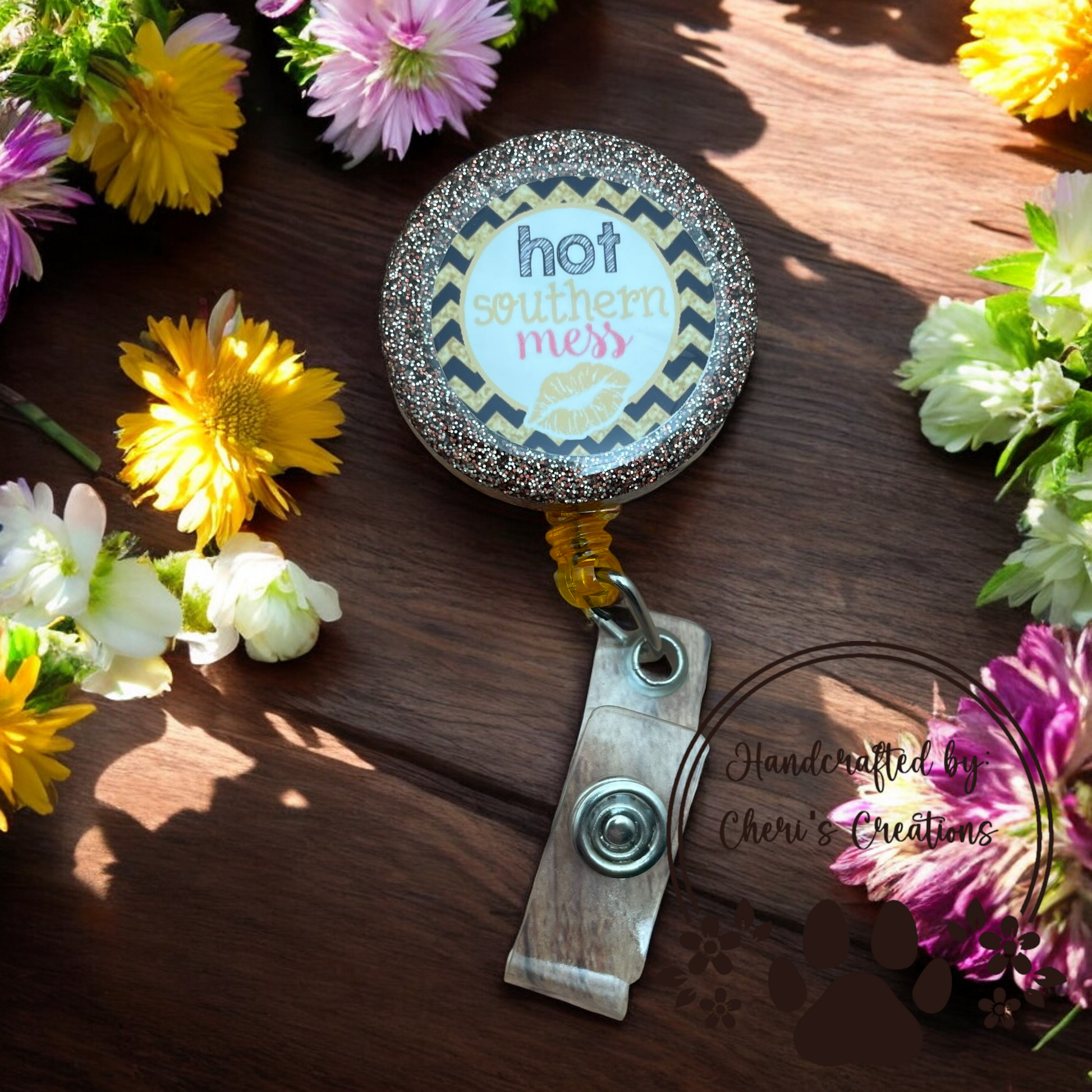 Add some Southern charm to your style with this bold badge reel! Featuring a resin center that proudly says 'Hot Southern Mess,' this accessory is perfect for anyone who embraces a little bit of sweet and a whole lot of spice. The playful design makes it a standout piece, bringing personality and a touch of humor to your work or school attire. Sturdy and stylish, this badge reel keeps your ID secure while showing off your vibrant Southern spirit!
