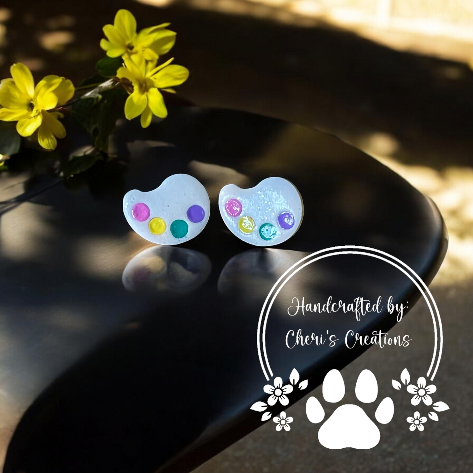 These delightful handmade paint palette stud earrings are perfect for art lovers and creative spirits. Each earring is crafted with care to resemble a miniature artist's palette, complete with colorful paint accents, adding a whimsical and artistic touch to your style. Lightweight and comfortable, they bring a pop of creativity to any outfit, whether you're dressing up for a fun occasion or adding a playful detail to your everyday look. These unique earrings make a perfect gift for artists or anyone who enjoys quirky, handmade jewelry with a splash of color.