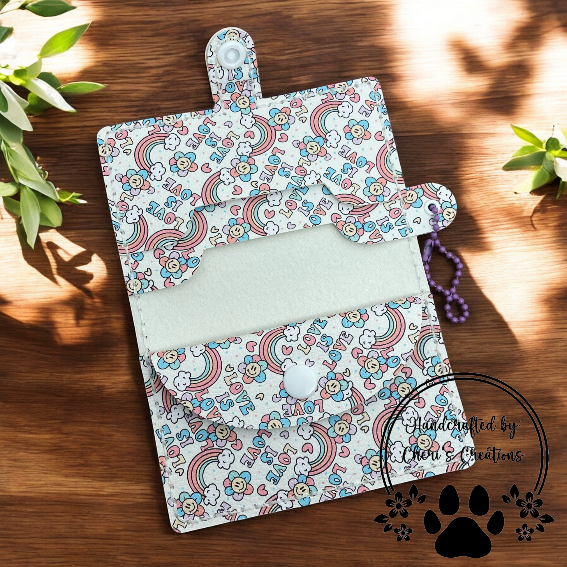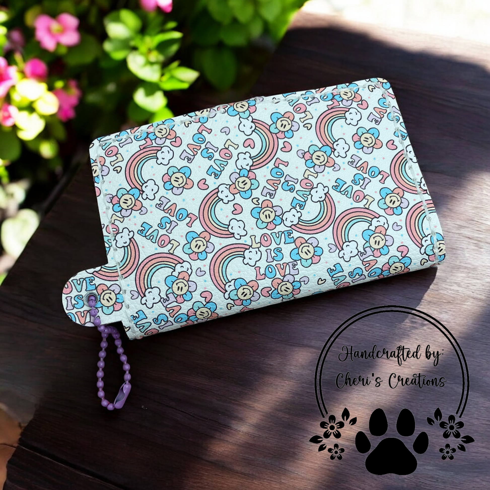 Celebrate love and positivity with our handmade coin and card wallet adorned with vibrant rainbows and beautiful flowers, featuring the heartfelt message "Love is Love." This enchanting wallet is perfect for organizing your coins and cards while making a statement about inclusivity and acceptance. Crafted with care, it includes a secure snap closure and a convenient ball chain loop for easy attachment to bags or keys. Embrace your values with this colorful accessory that combines style and functionality!