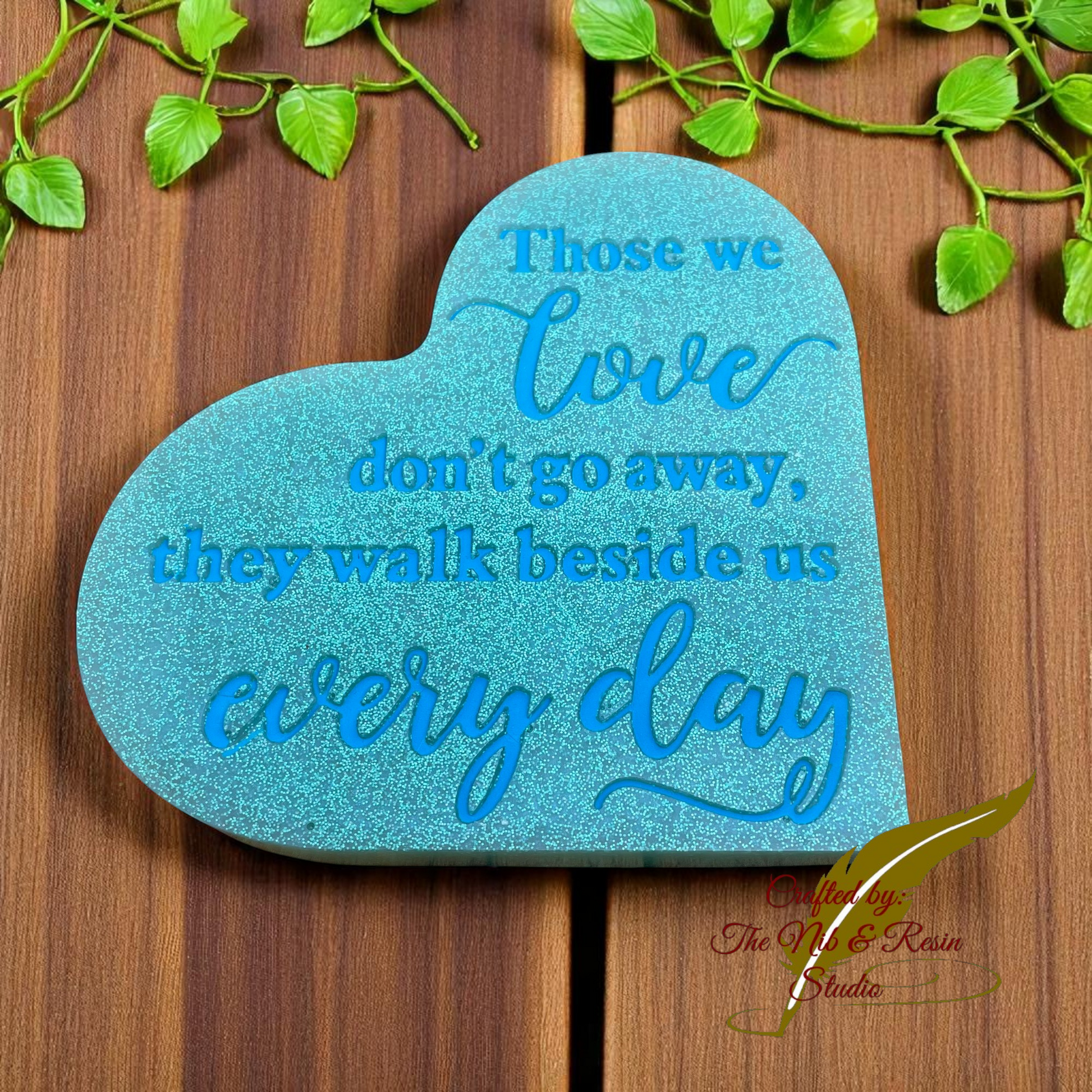Honor the memory of a loved one with this handmade resin memorial heart, a heartfelt keepsake crafted with care and meaning. This beautiful piece features a rich blue glitter background that sparkles warmly in the light, paired with darker blue lettering that reads: