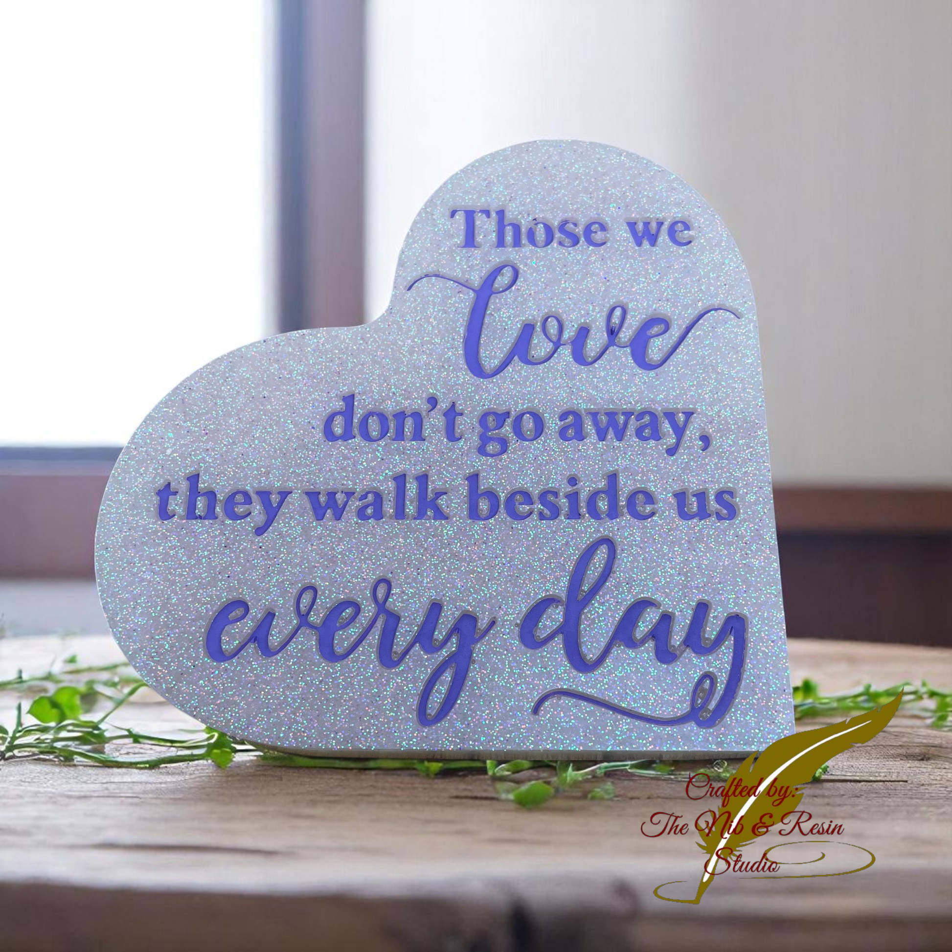 Each heart is carefully poured with high-quality resin and fine glitter, creating a stunning, shimmering effect that captures the spirit of remembrance and love. The deep, soothing shades of purple symbolize peace, spirituality, and everlasting affection, making it a meaningful addition to any memorial space.