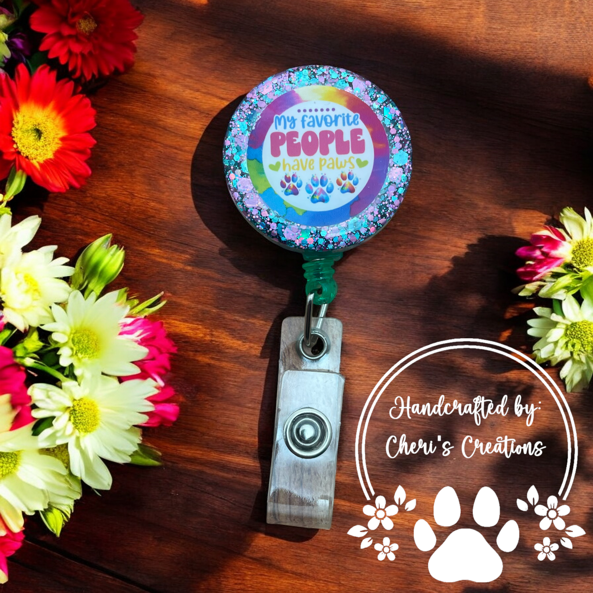 Celebrate your love for furry friends with this adorable badge reel! Featuring a resin center with the words 'My Favorite People Have Paws,' this accessory is a must-have for pet lovers who know their best friends walk on four legs. The playful design adds charm to any work or school attire, while the high-quality, durable materials keep your ID secure. Perfect for adding a touch of paw-sitive energy to your day and sharing your love for pets with everyone you meet!