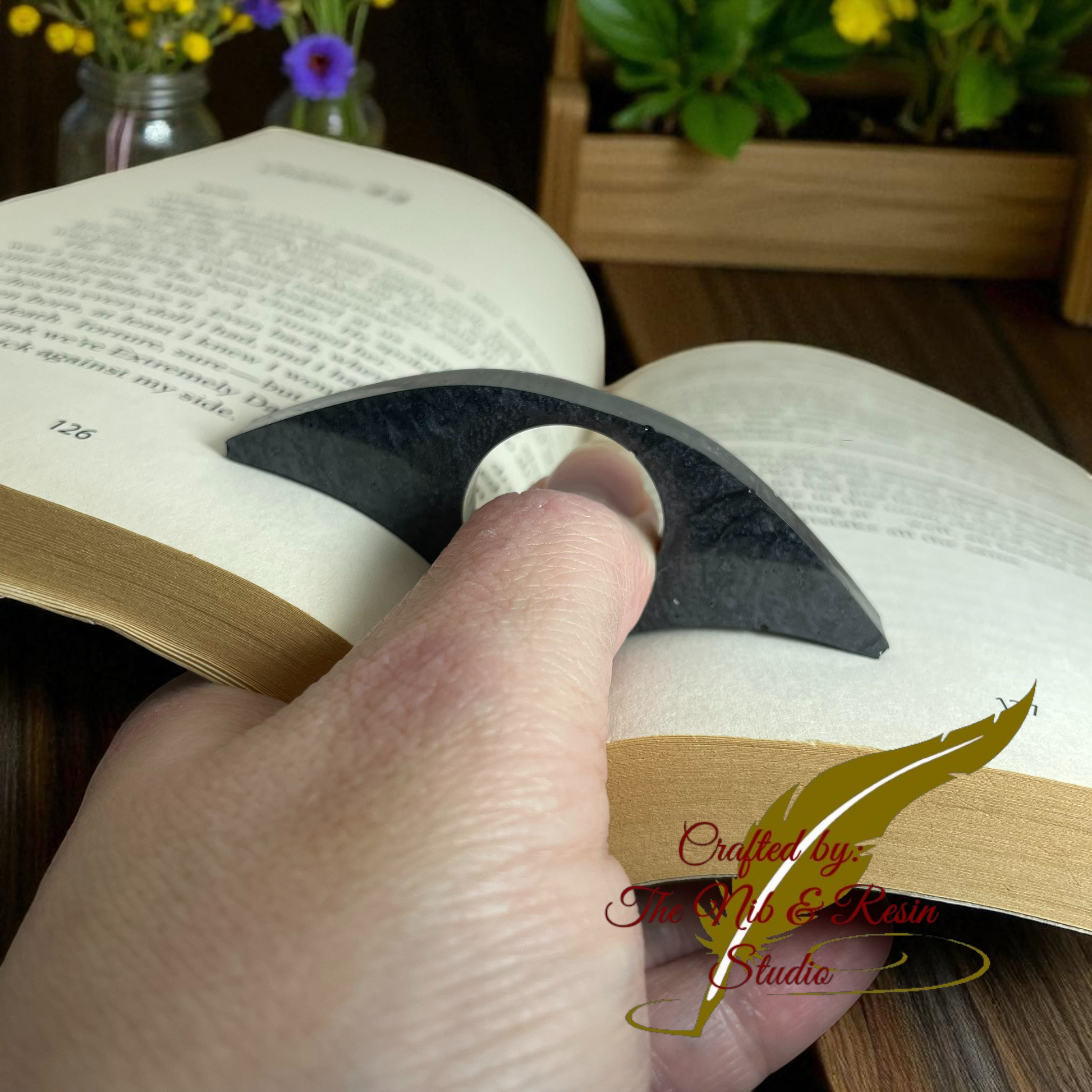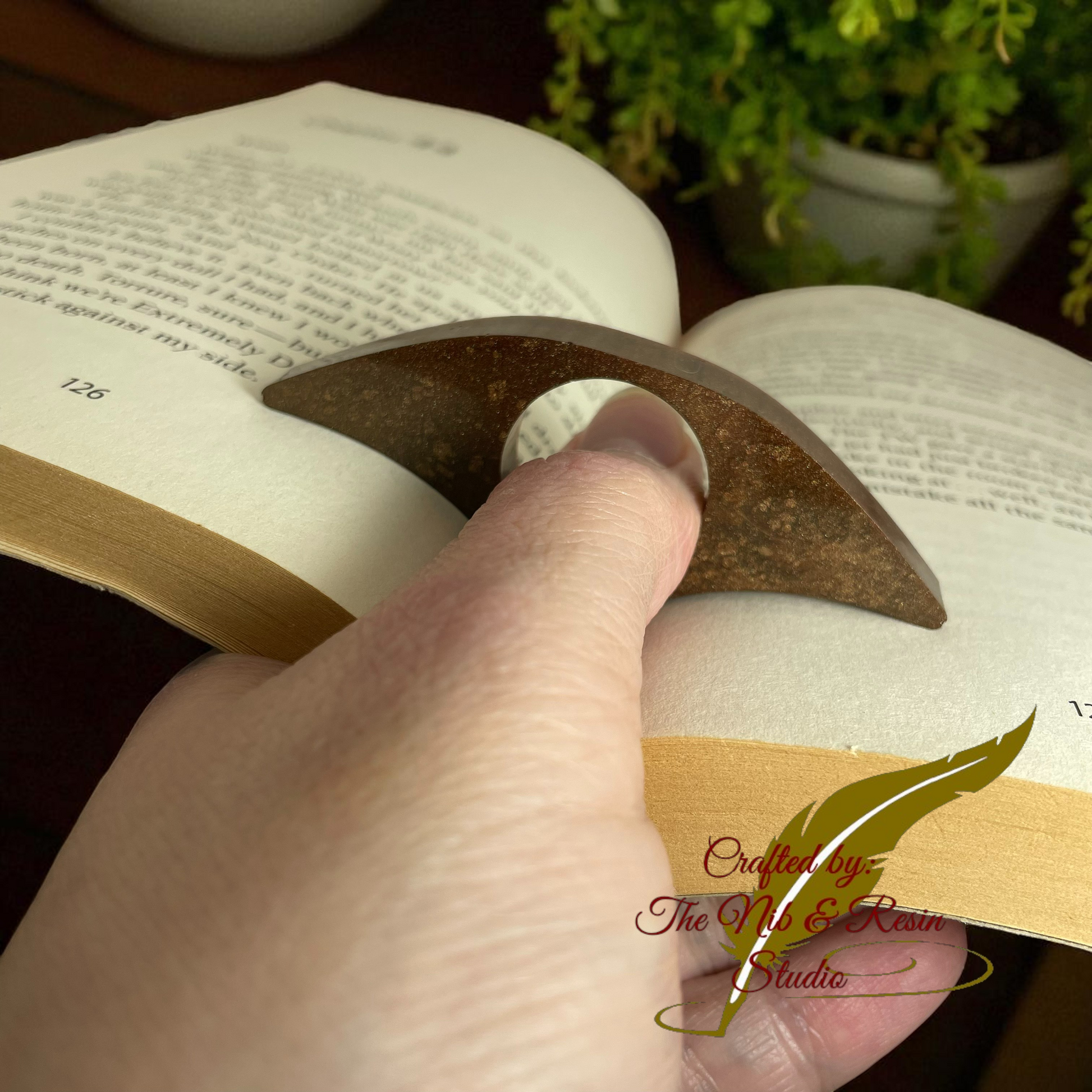 Keep your hands free and your pages perfectly in place with this elegant resin page holder. Handcrafted with durability and comfort in mind, this sleek reading accessory fits snugly in your book’s page gutter (where the pages meet), while the ergonomic thumb hole ensures a natural, relaxed grip.