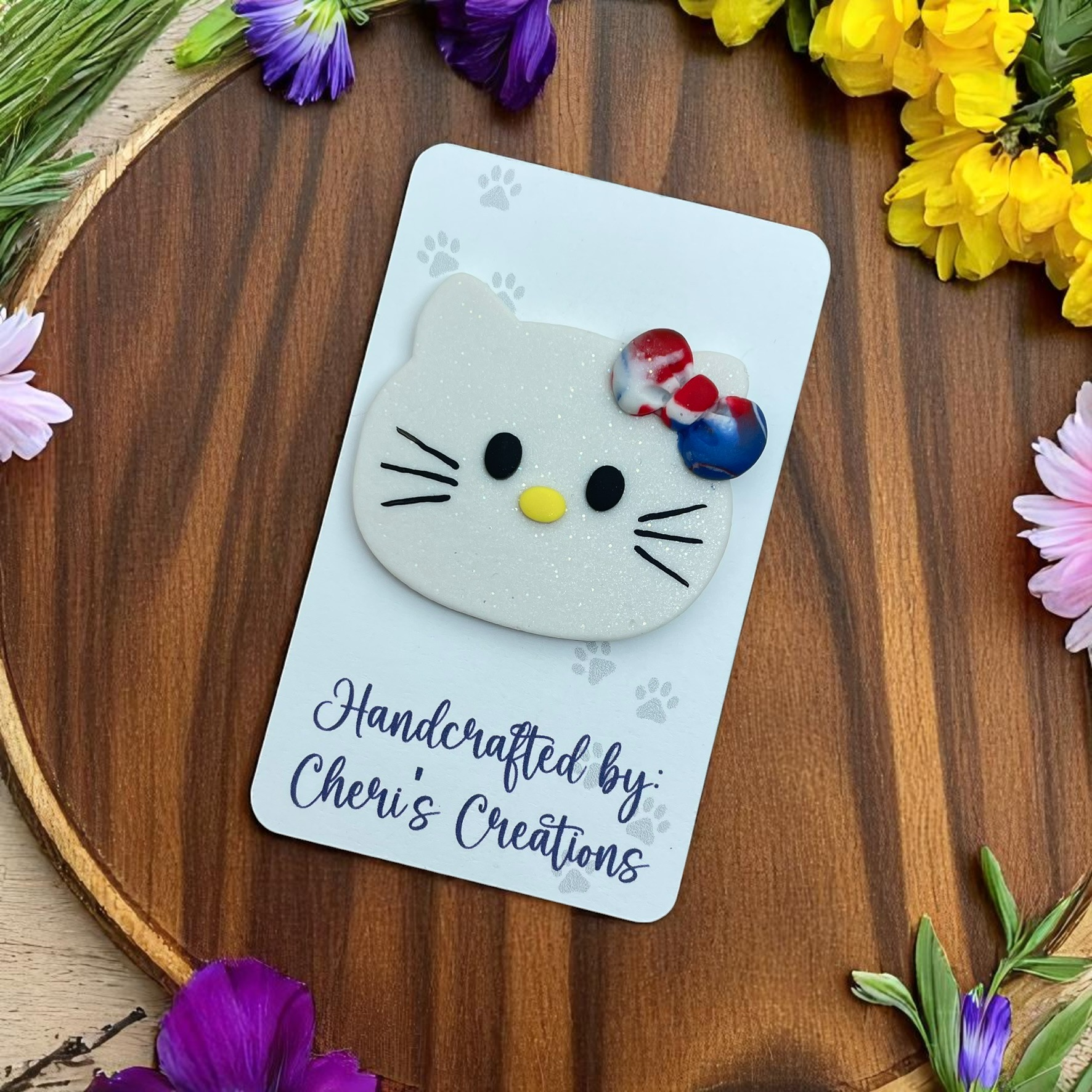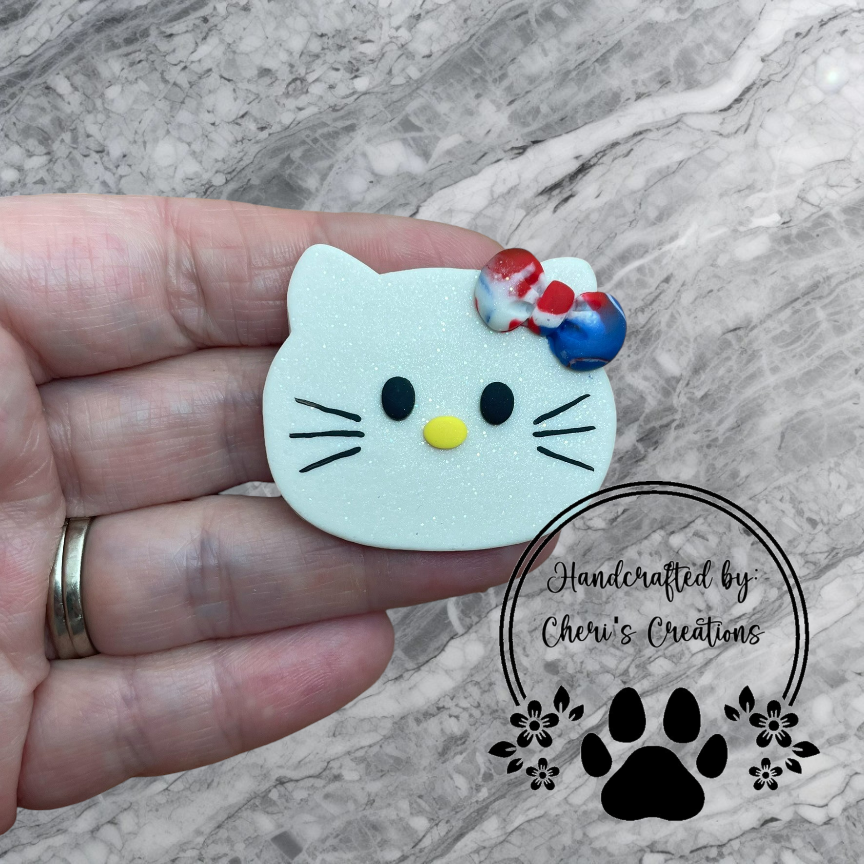 This handmade polymer clay embellishment features an adorable kitty-inspired head design, styled with a festive red, white, and blue bow for the perfect patriotic accent. With its sweet expression and clean detailing, this piece brings a playful yet meaningful flair to your crafting projects—great for celebrating holidays like Independence Day or Memorial Day with handmade charm.