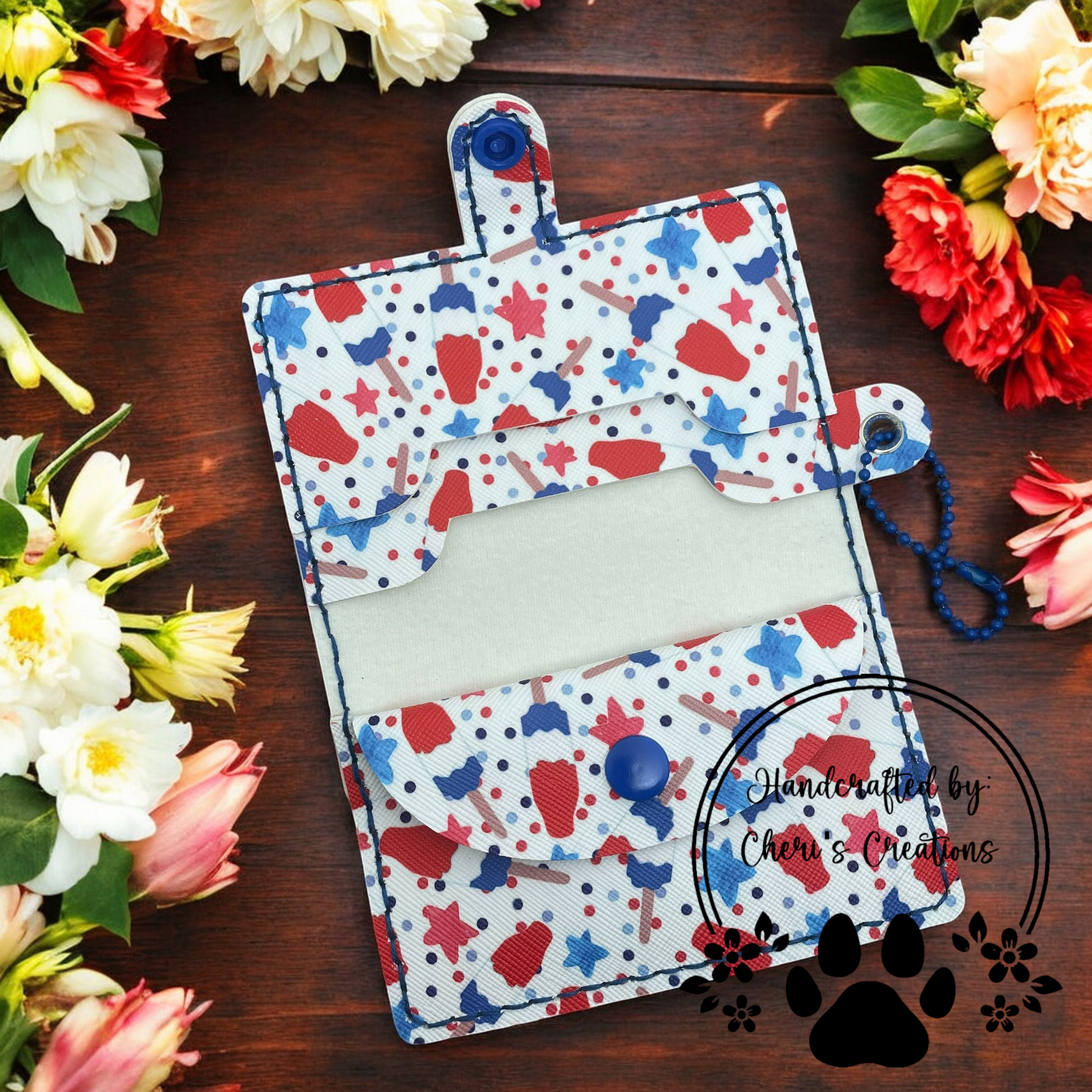Celebrate the spirit of freedom with this fun Patriotic Popsicle Coin and Card Wallet, featuring a playful design of red, white, and blue popsicles. Perfect for adding a touch of Americana to your daily essentials, this wallet is both vibrant and practical. It comes with secure snap closures to keep your coins and cards safe, and a convenient ball chain keyring for easy attachment to your bag or keys. Compact, functional, and festive, it’s the ideal accessory for patriotic outings or anytime you want to carry a piece of summer with you!