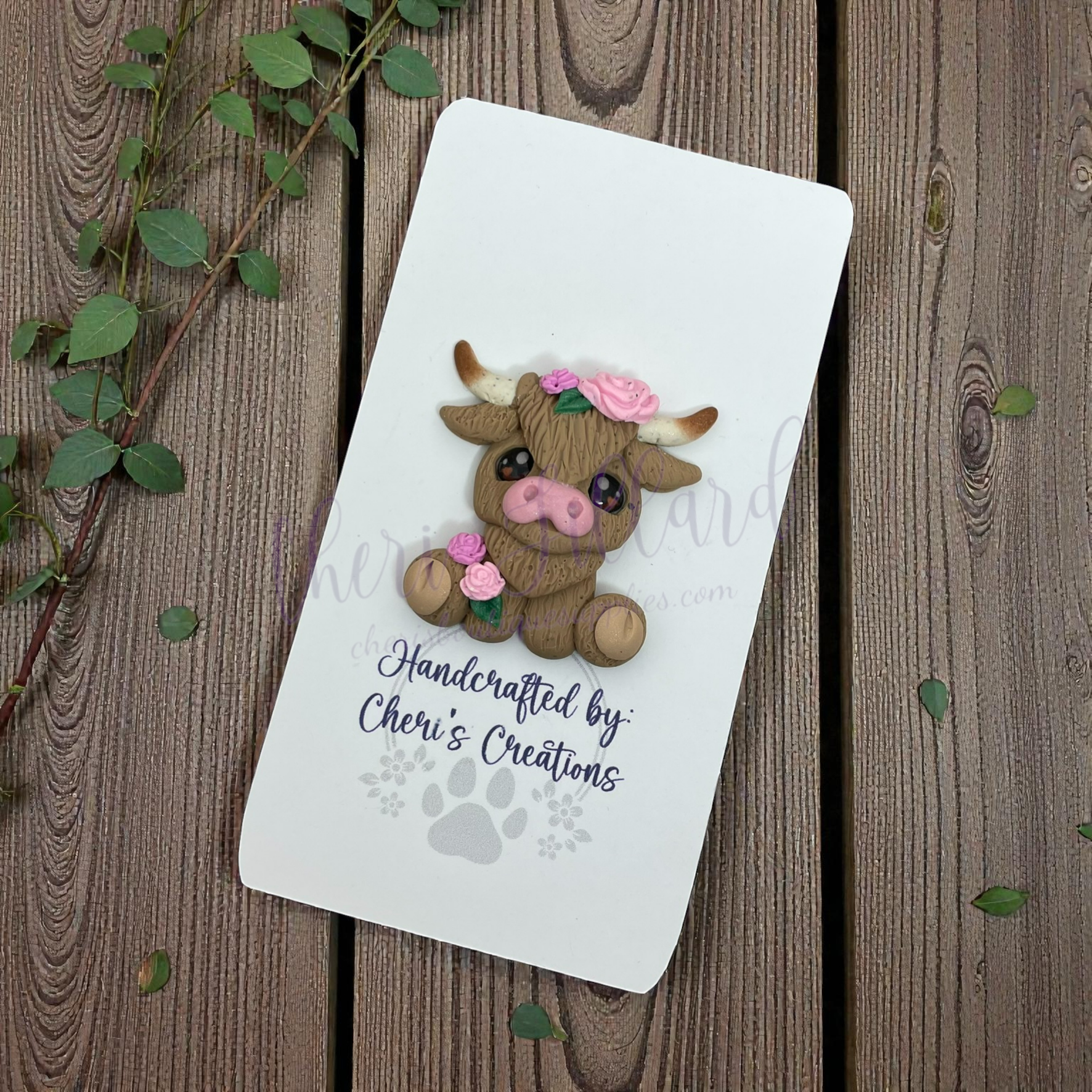 Pink Floral Highland Cow Bow Center – Handmade Polymer Clay Embellishment