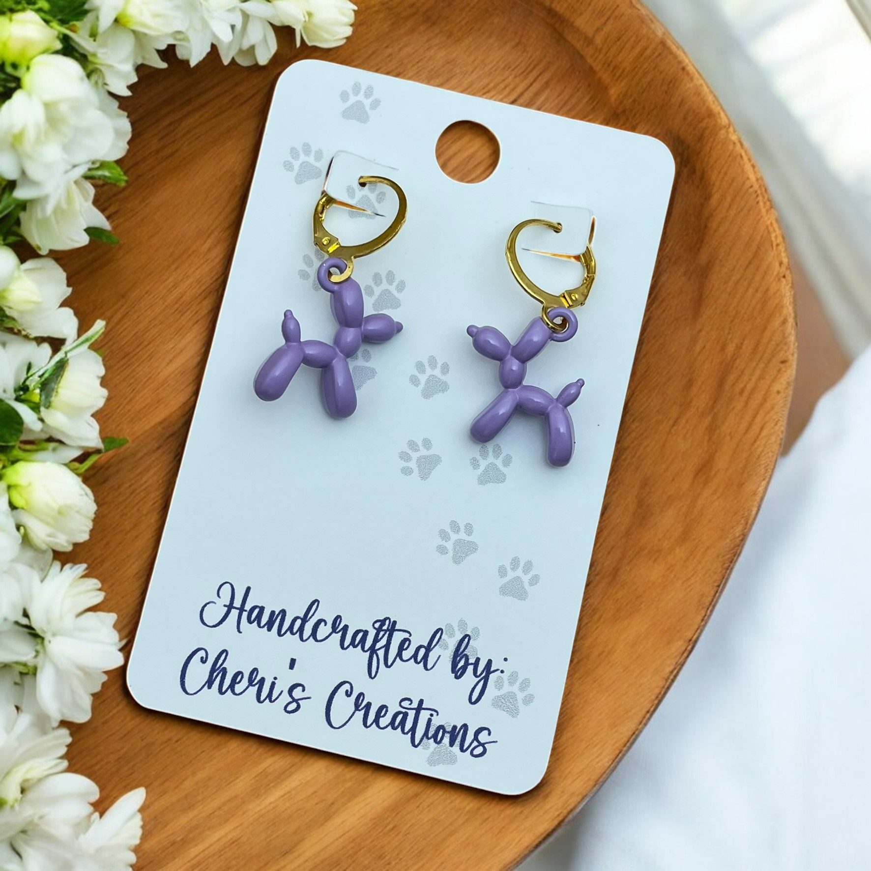 Step into a world of whimsy with these handmade purple balloon dog dangle earrings! Crafted from enamel, each earring features a charming balloon dog design in a magical shade of purple, bringing playful vibes and a touch of enchantment to any outfit. Dangling from stainless steel lever back hoops, they’re lightweight, comfortable, and ready to accompany you on all your adventures.