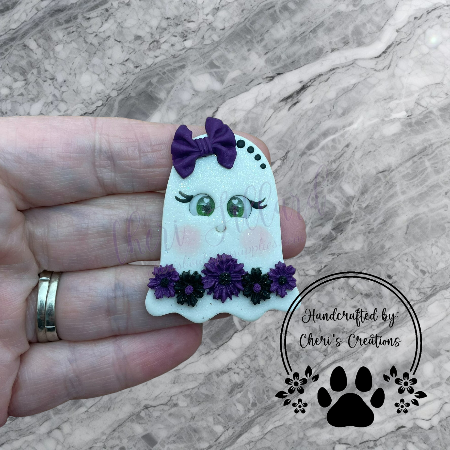 Cute with a touch of spooky charm, this purple floral ghost clay embellishment adds a whimsical twist to your handmade creations. The soft floral details give it a unique look that’s perfect for bows and crafts that mix sweet style with a hint of Halloween fun.