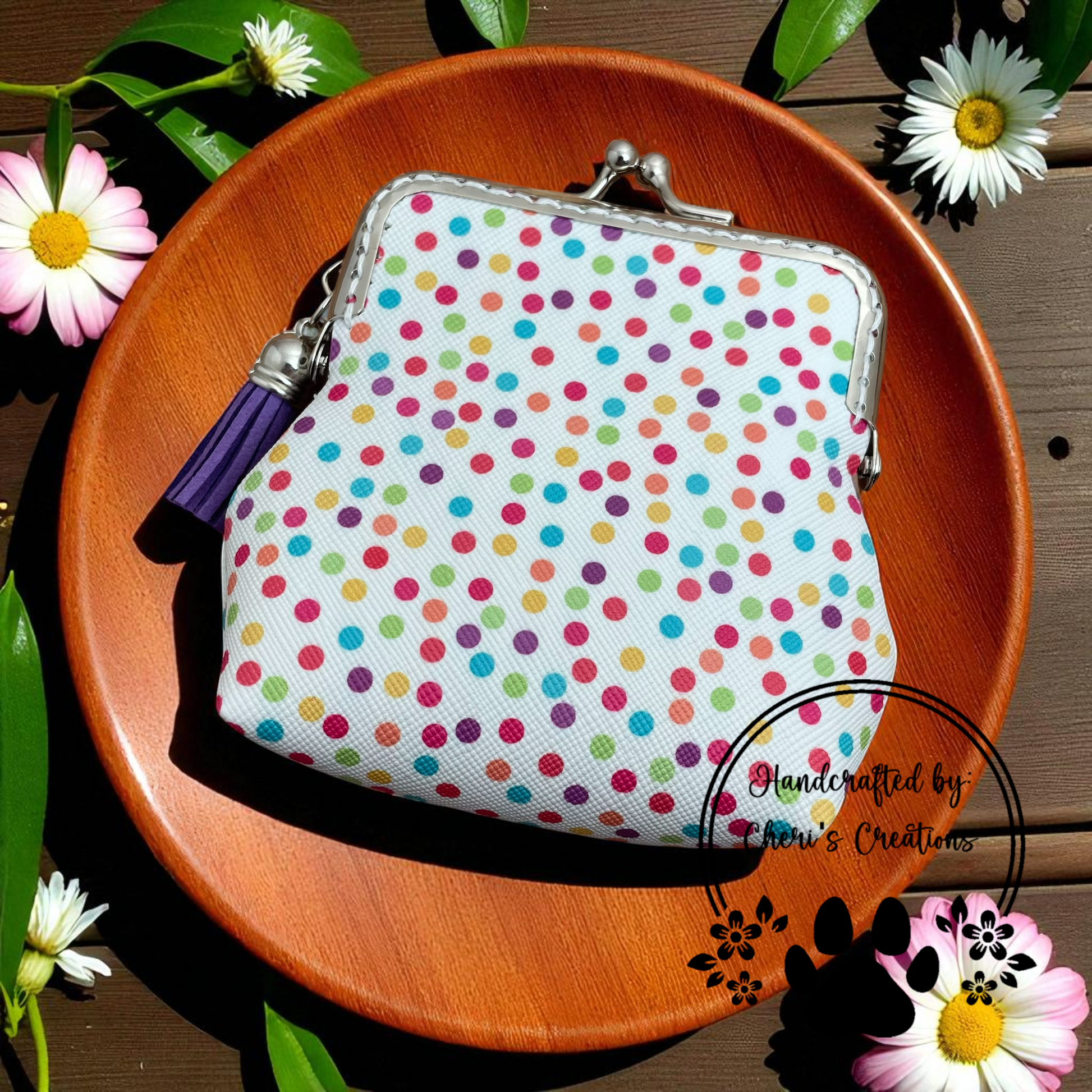 This handmade faux leather change purse features a playful and colorful rainbow polka dot print that’s sure to brighten your day! With vibrant dots scattered across a clean background, this cheerful design is full of personality and fun—perfect for adding a pop of color to your everyday essentials.