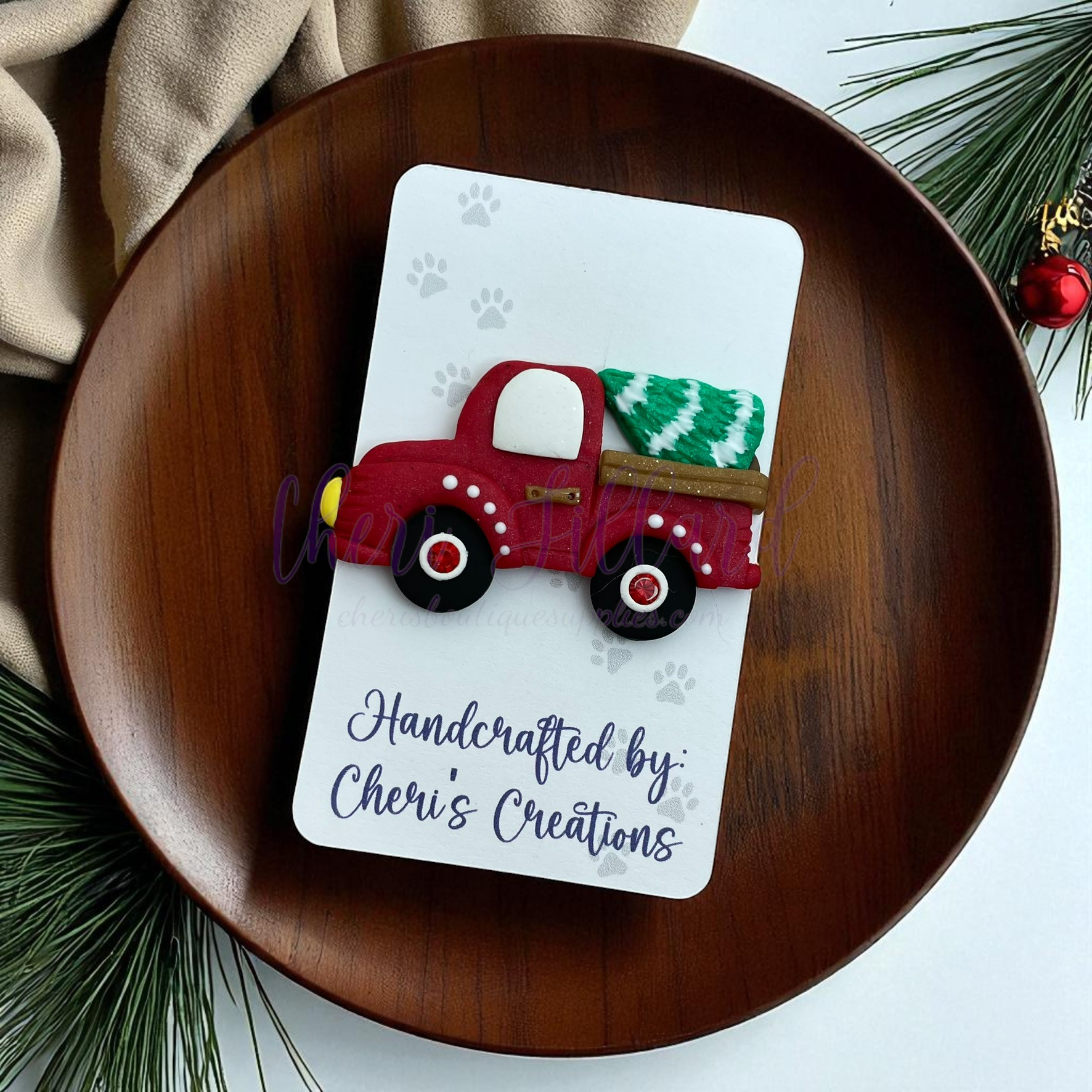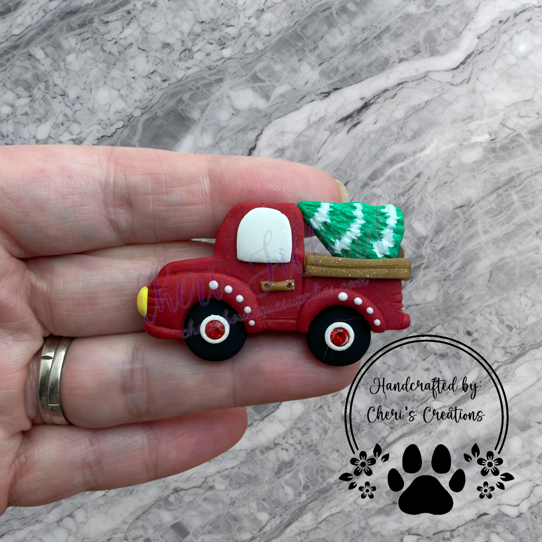 This handmade polymer clay embellishment features a classic red pickup truck hauling a festive green Christmas tree. With its nostalgic holiday charm and vibrant colors, this piece is perfect for embellishing hair bows, magnets, keychains, scrapbook pages, and other seasonal crafts.