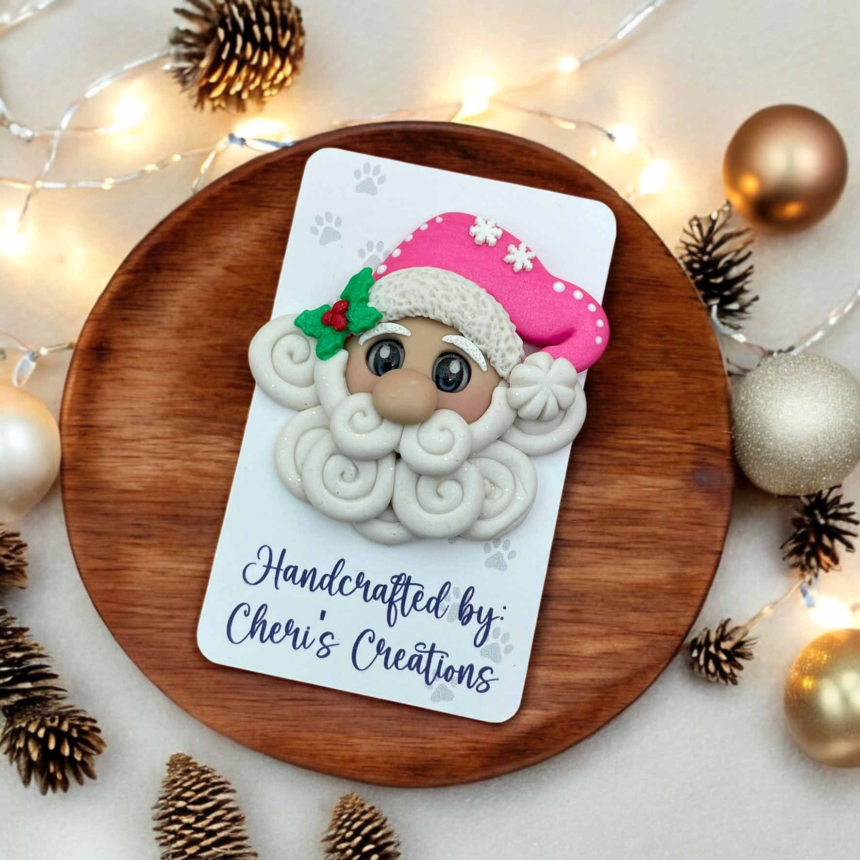 Bring festive charm to your holiday creations with this handmade polymer clay embellishment featuring a sweet Santa face topped with a pastel pink hat. His hat is adorned with holly berries, tiny leaves, and delicate snowflakes—perfect for soft, whimsical Christmas themes. Ideal for hair bows, ornaments, magnets, and more!