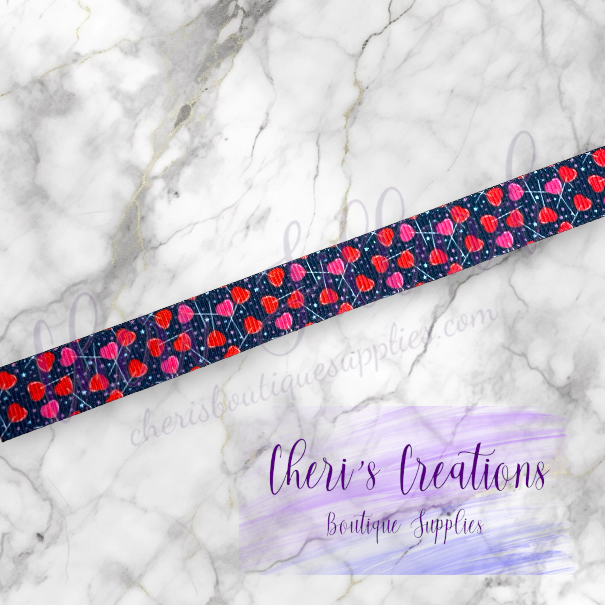 This sweet and playful grosgrain ribbon features Valentine heart lollipops floating on a bold black background, creating a striking contrast that makes the vibrant candy design pop. The heart-shaped lollipops add a fun, festive touch, making this ribbon perfect for Valentine’s Day crafts, romantic-themed projects, or any creation that needs a little extra love.