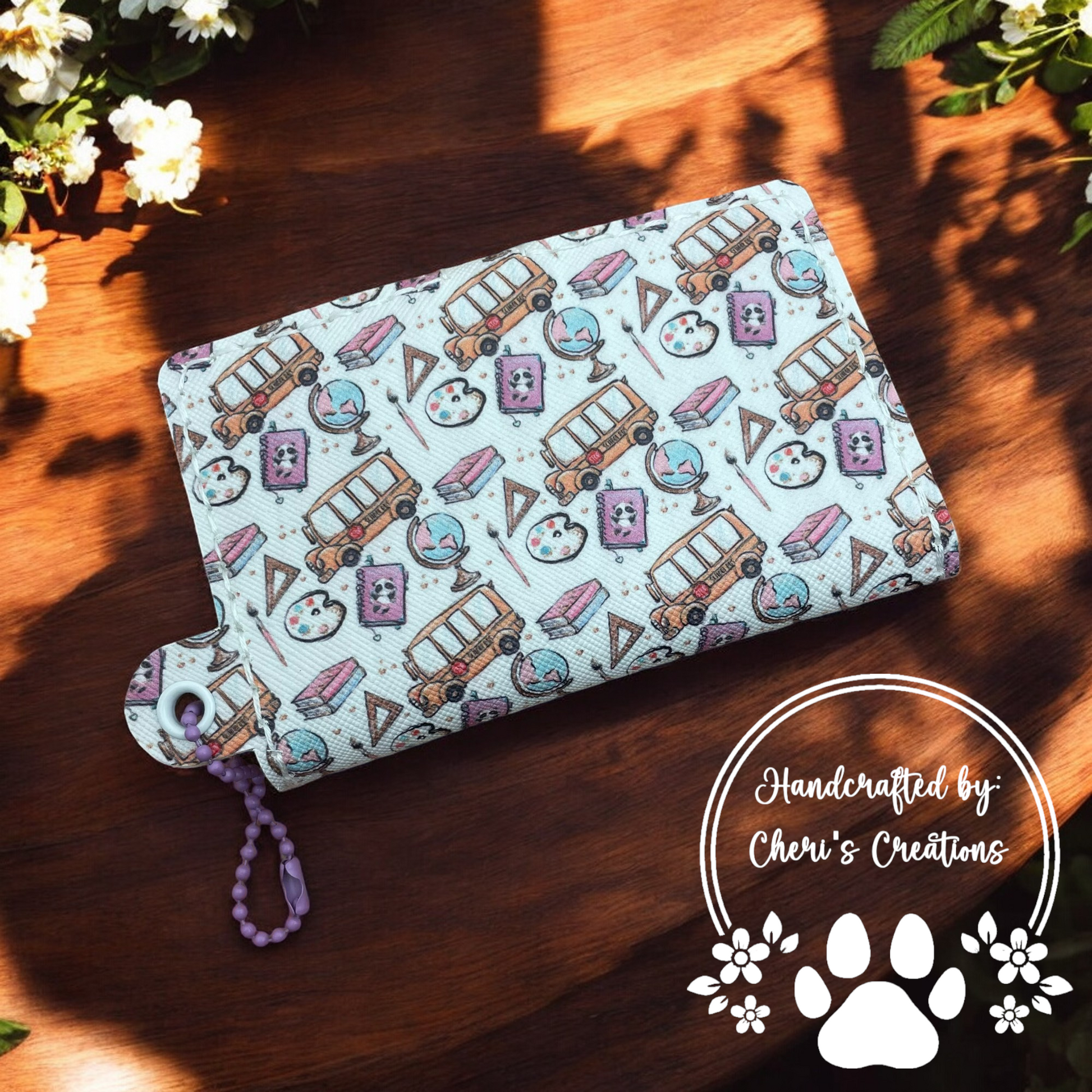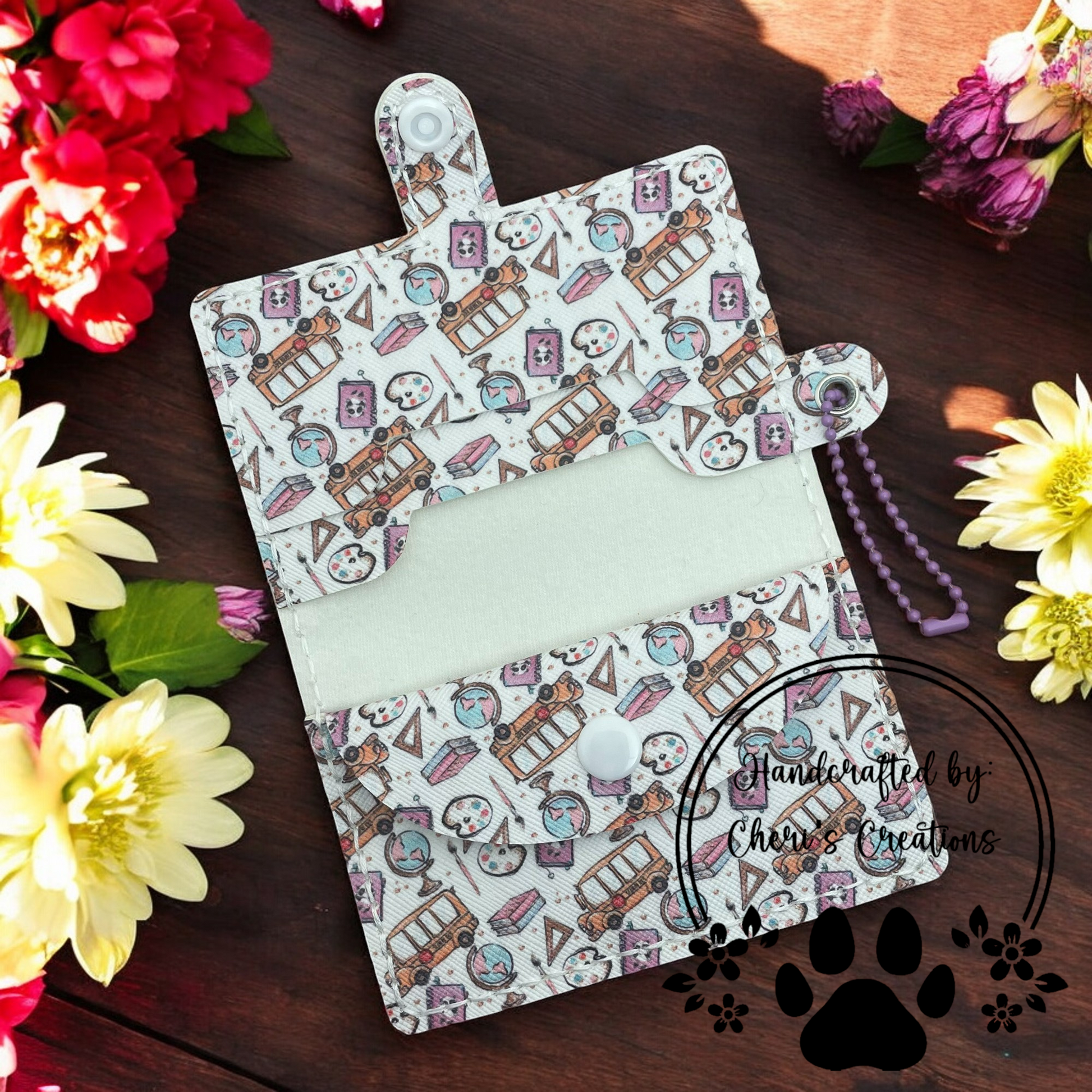 Celebrate back-to-school vibes with this adorable School Bus & Supplies Coin and Card Wallet, featuring a playful design of school buses, pencils, and other school supplies. Perfect for teachers, students, or anyone who loves the back-to-school season, this wallet combines style with practicality. It features secure snap closures to keep your coins and cards safe, along with a ball chain keyring for easy attachment to your bag or keys. Compact and convenient, it’s the perfect way to carry your essentials while showing off your school spirit!