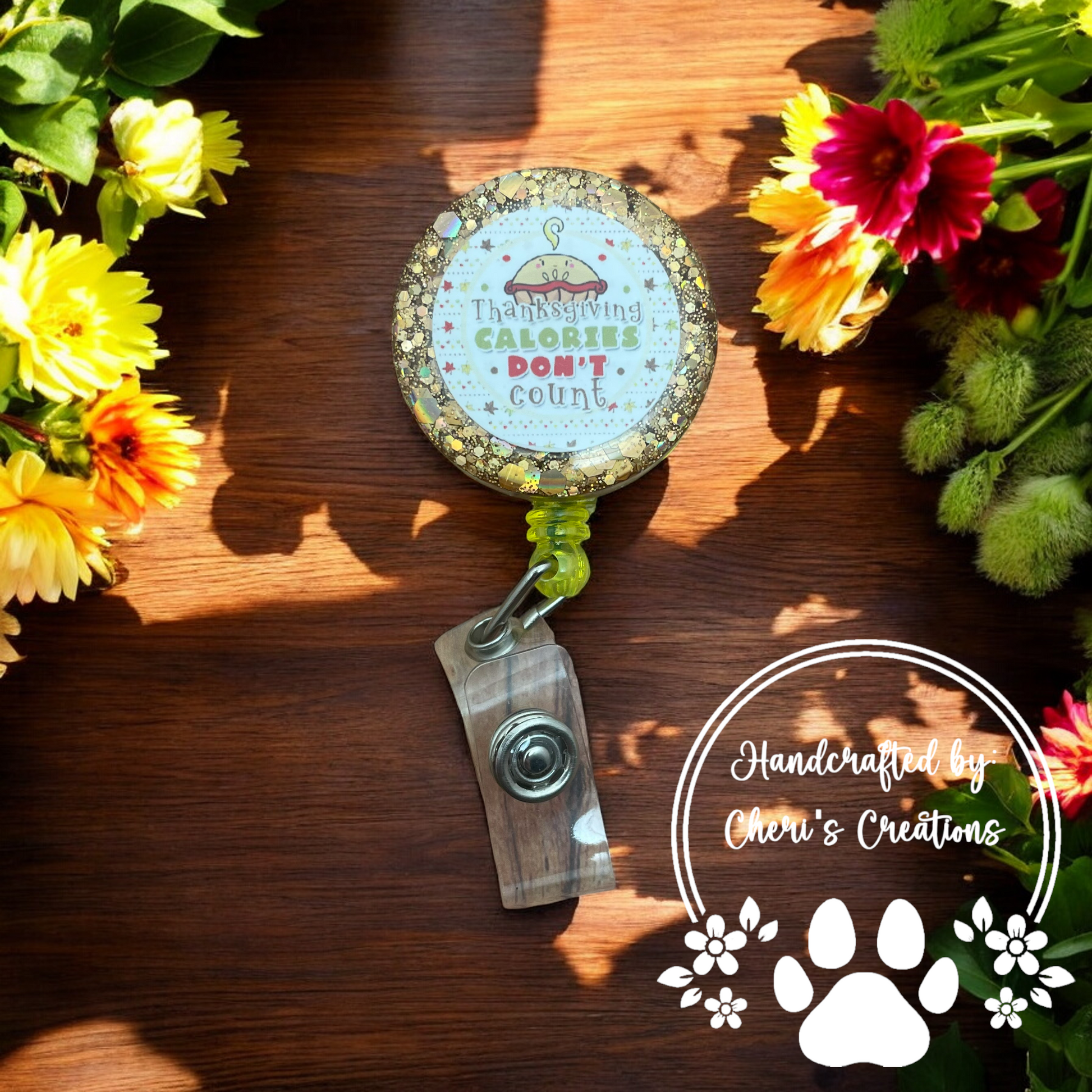 Celebrate the holiday spirit with our festive badge reel featuring a charming resin centerpiece that proclaims, "Calories Don't Count!" adorned with autumn leaves and a cheerful turkey. This whimsical badge reel combines functionality with a playful message, making it the perfect accessory for Thanksgiving gatherings or everyday wear. The high-quality retractable reel ensures that your ID or keys are always within reach while adding a touch of fun to your outfit. With its vibrant design and reliable mechanism, this badge reel is an ideal way to showcase your love for the season while staying organized!