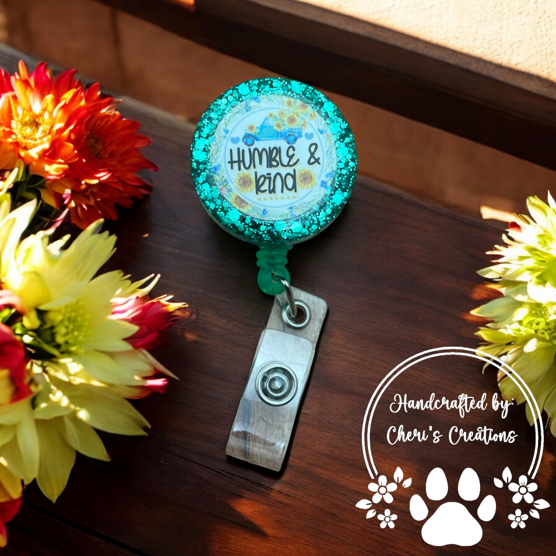 Embrace positivity with our beautiful badge reel featuring a resin centerpiece that showcases the inspiring words "Humble & Kind," surrounded by vibrant sunflowers. This charming design blends functionality with a heartfelt message, making it a perfect accessory for those who value kindness in their everyday lives. The high-quality retractable reel ensures that your ID or keys are always within easy reach while adding a touch of warmth and cheer to your outfit. With its uplifting aesthetic and reliable mechanism, this badge reel is an ideal way to express your values while staying organized!