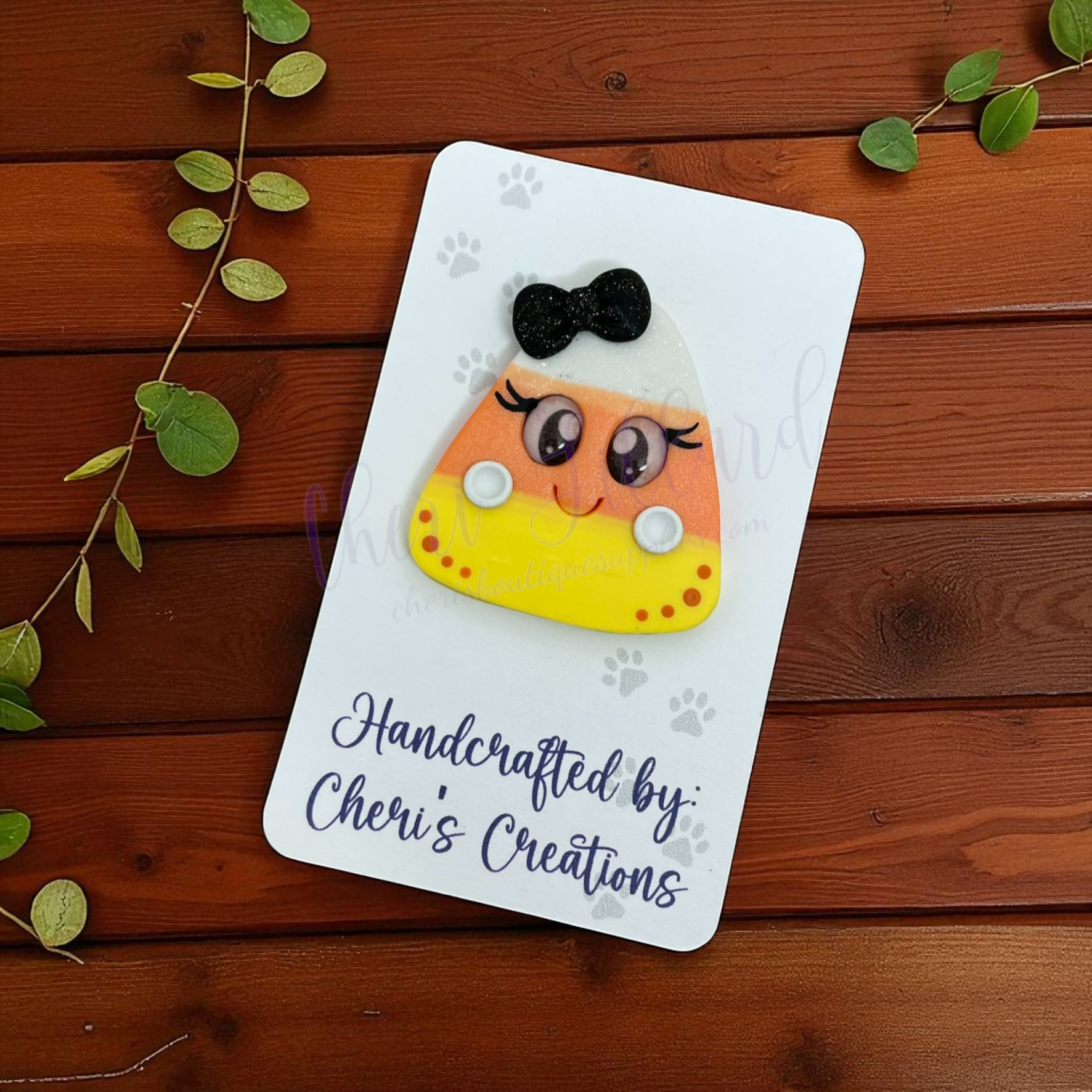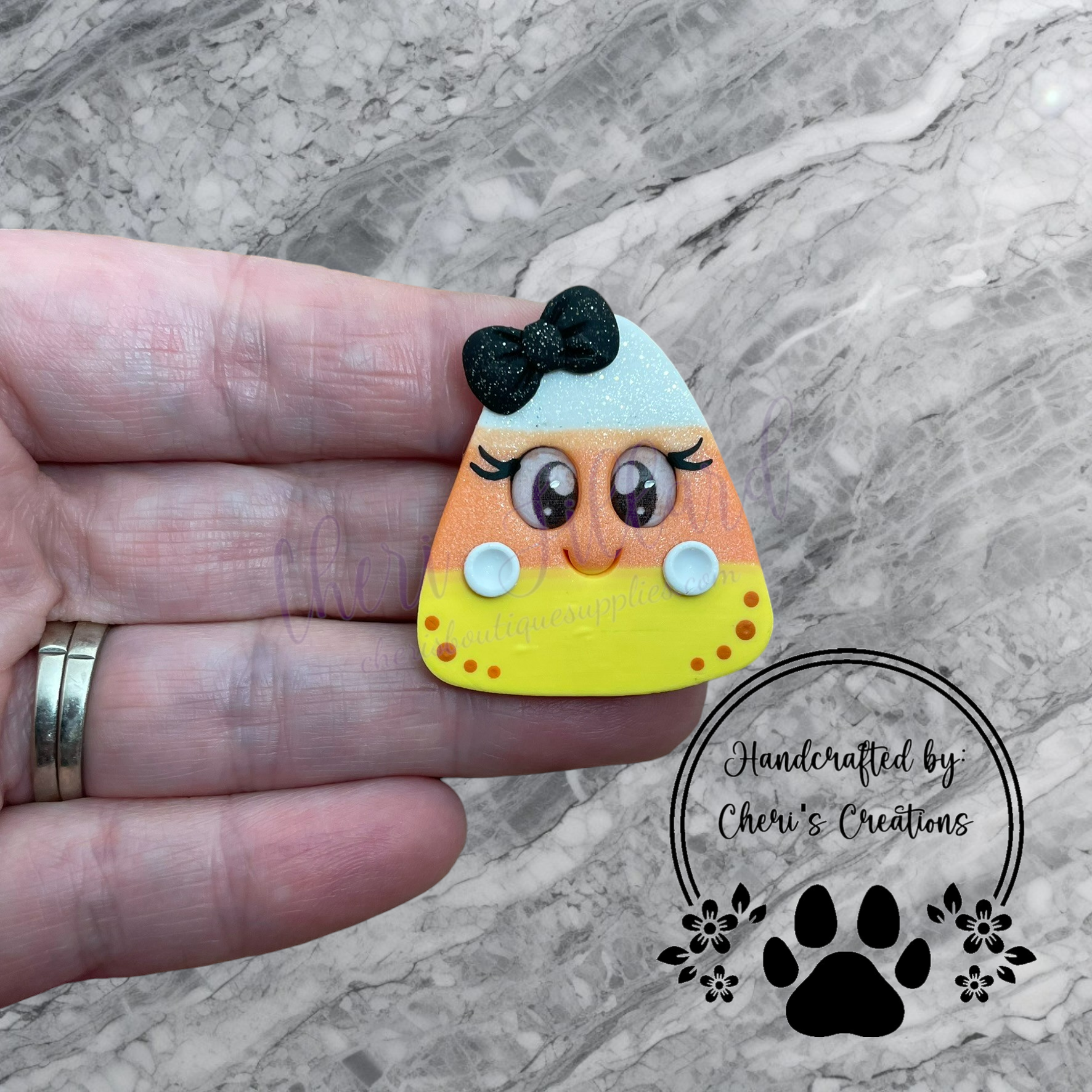 Celebrate the sweet spirit of autumn with this handmade polymer clay embellishment featuring a classic candy corn in traditional orange, yellow, and white colors. This cute and colorful charm is perfect for seasonal bows, keychains, scrapbooking, and more — adding a festive touch to your fall and Halloween projects.