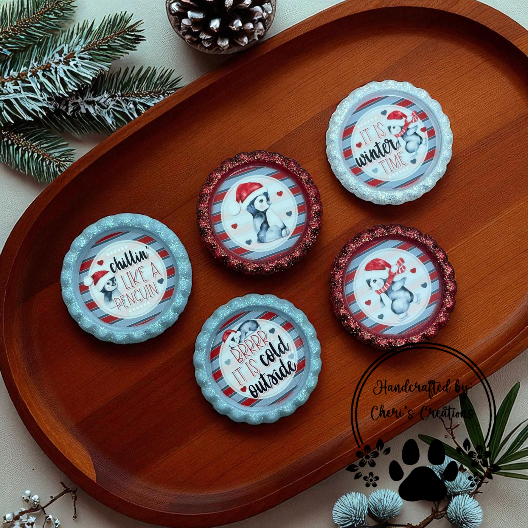 Celebrate the chilly season with this Winter Penguin-themed set of handpainted bottle caps. Featuring a cozy color palette of red, grey, and white, each cap showcases adorable penguin designs paired with frosty winter accents.