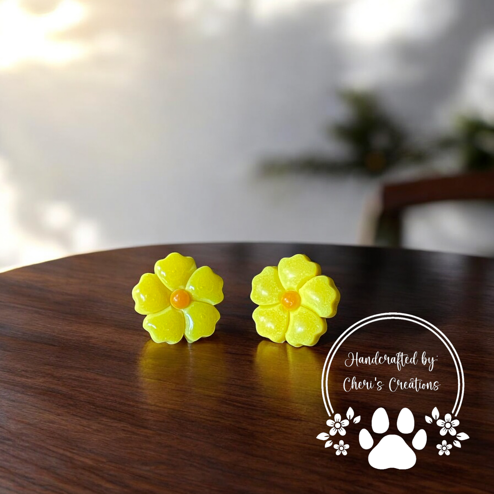 Add a sunny touch to your jewelry collection with these delightful yellow five-petal flower stud earrings! Handmade with love, these vibrant earrings feature a cheerful floral design that radiates warmth and joy. The bright yellow hue is perfect for brightening up any outfit, whether you’re dressing up for a special occasion or adding flair to your everyday look. Lightweight and comfortable, these studs are designed for effortless wear. Let these charming flower earrings bring a splash of color and a smile to your day!